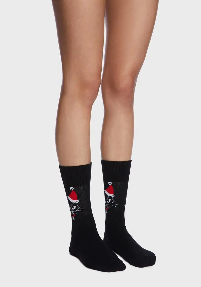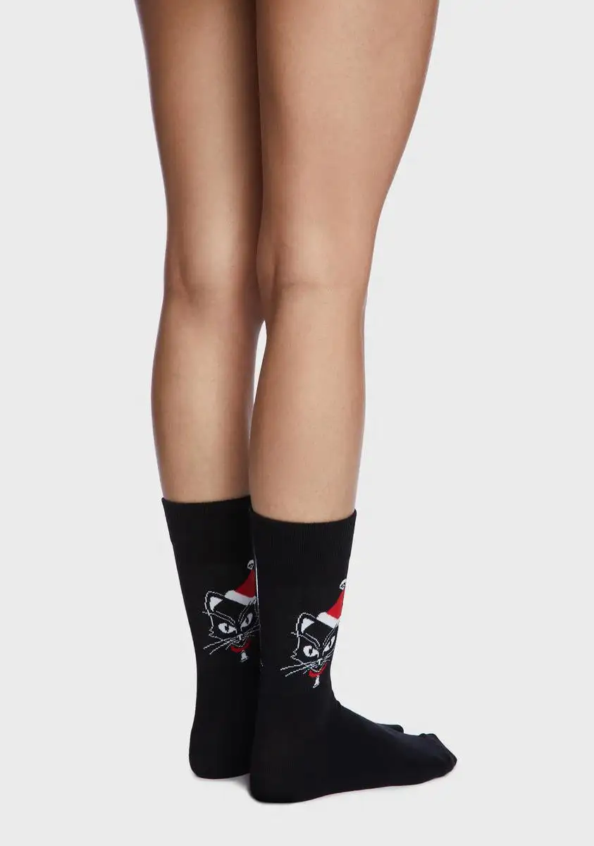 we wish you a meowy Christmas! These crew socks have Santa hat-wearing cats printed at sides, a knit construction, and ribbed trim.