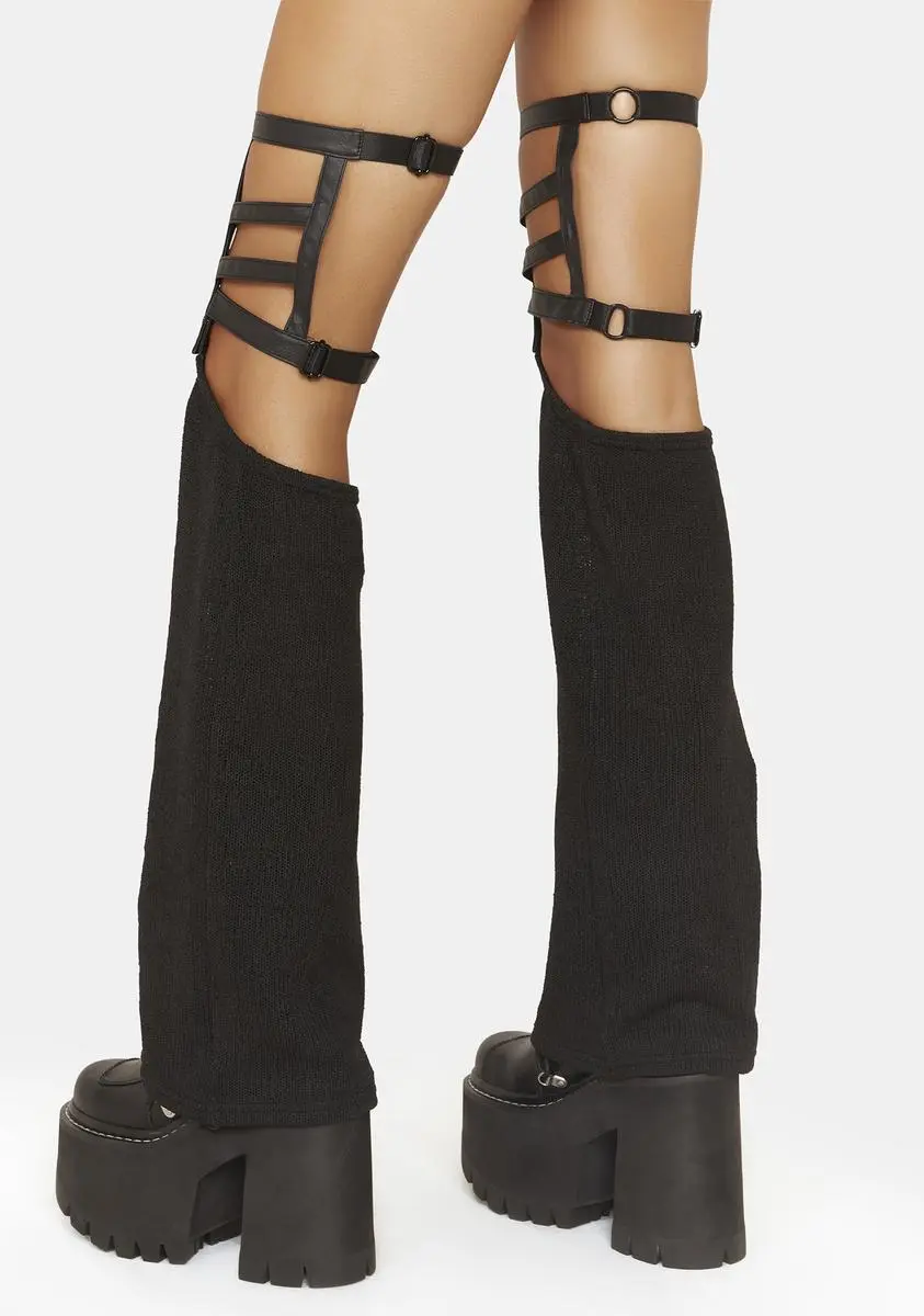 embrace the chaos. These leg warmers have a knit construction, a flared leg silhouette, a strappy vegan leather design at the thighs, and snap button closures.