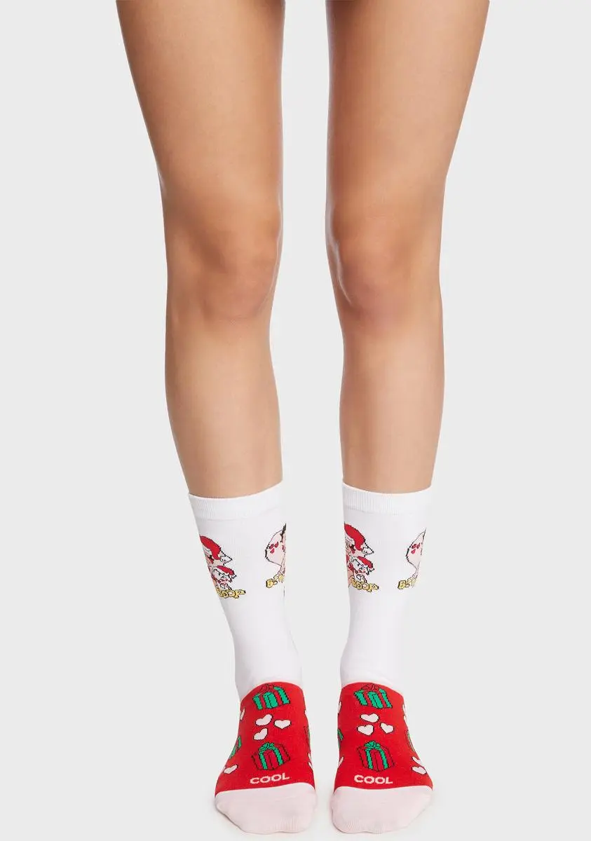 cuz boop a doop! These crew socks have a knit construction, Betty Boop graphics on the sides, and a hearts and gift pattern on the uppers.