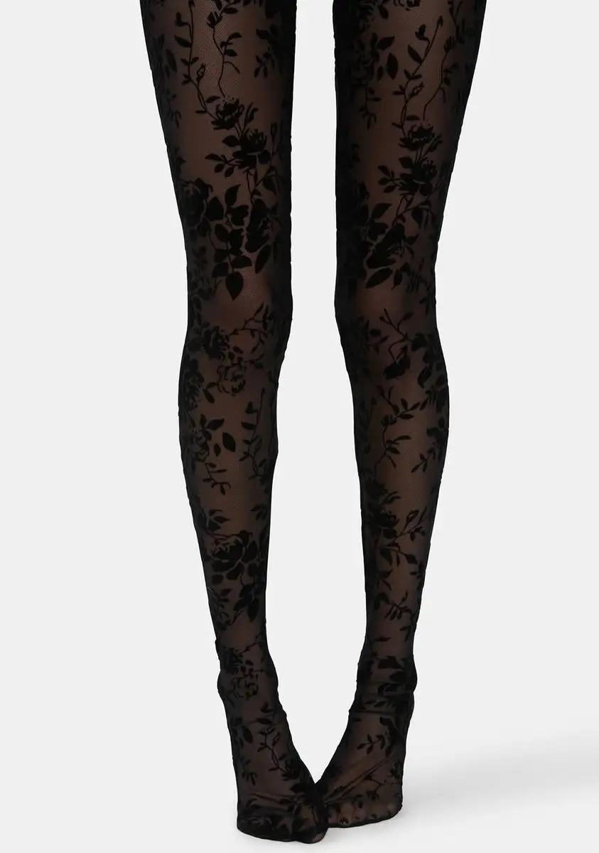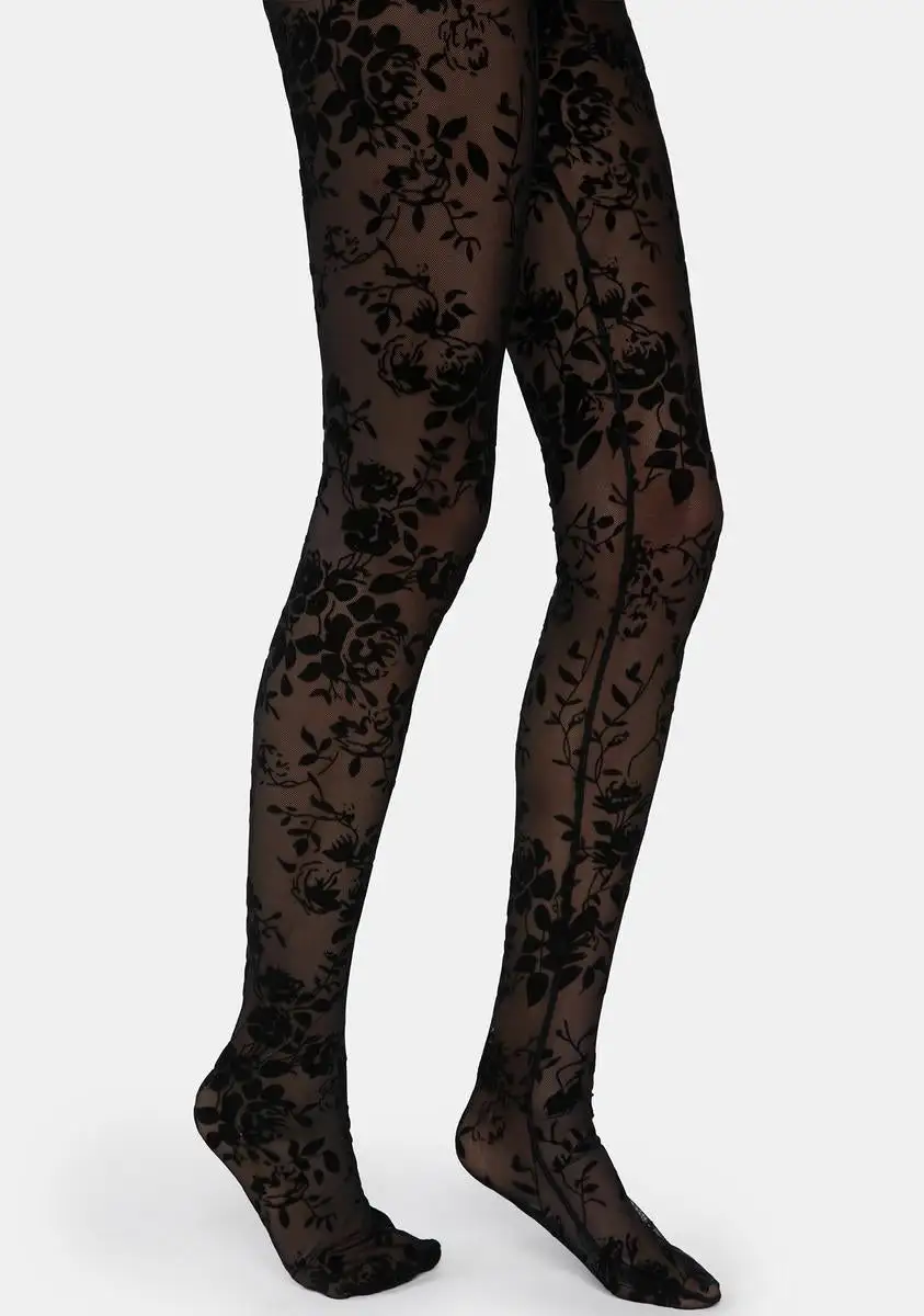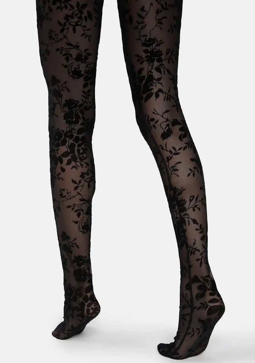 cuz you can’t help but fall in love! These tights have a stretchy sheer construction and a velvet floral flocked pattern all over.