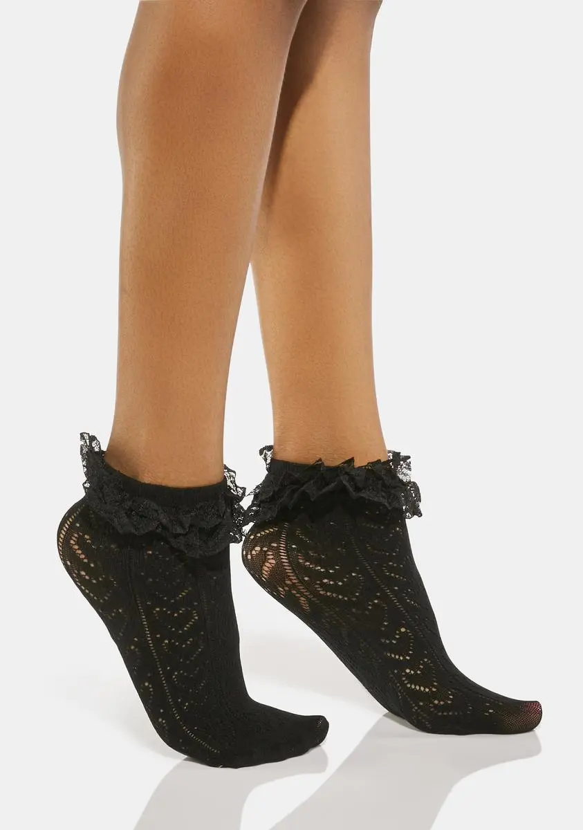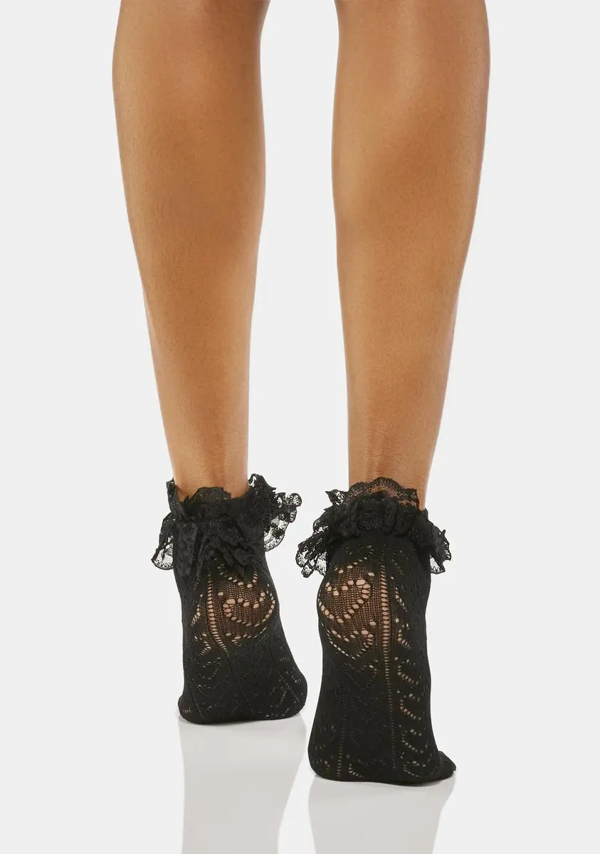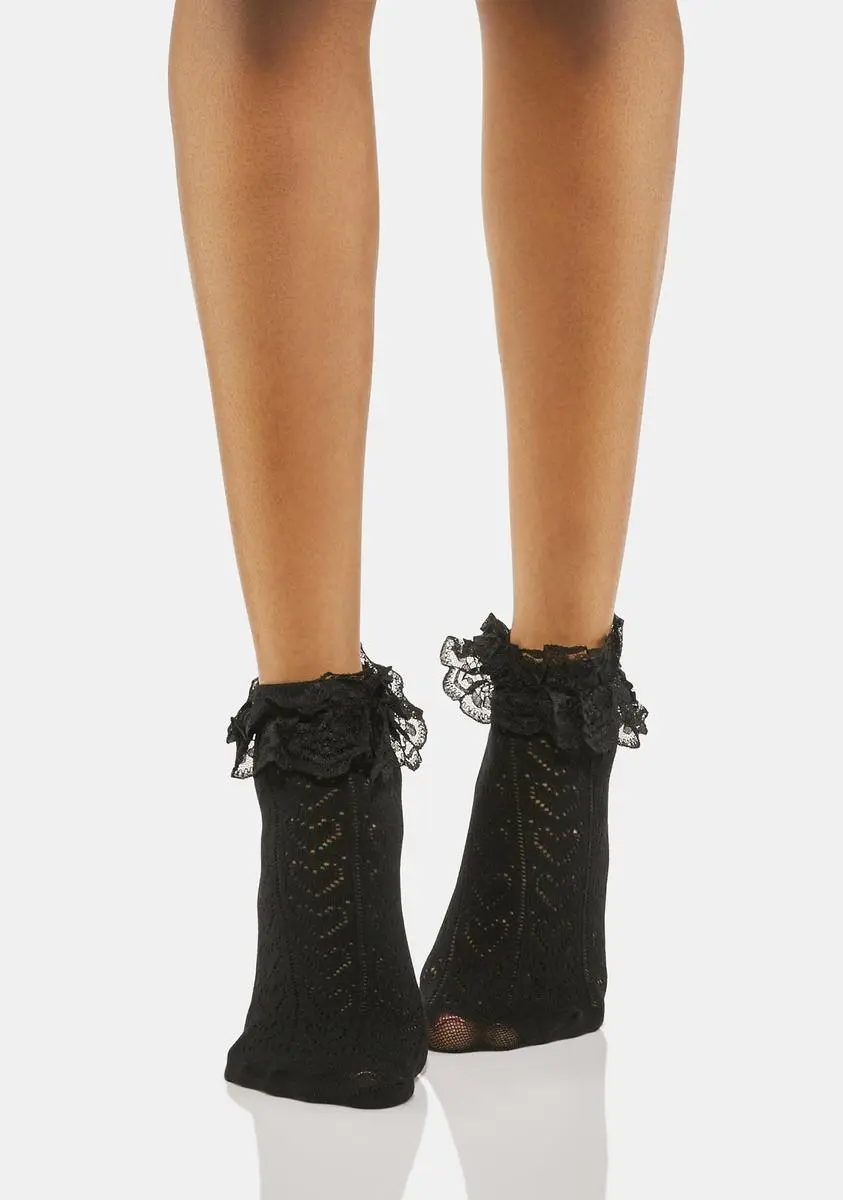 cuz you keep it cute! These pointelle knit ankle socks have a heart pattern all over and lace ruffle trim.