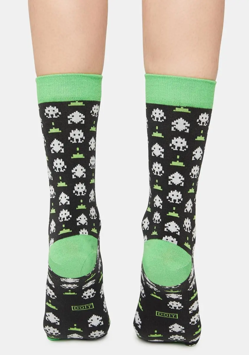 beat your high score! These crew socks have graphics inspired by retro video games with contrast trim and come in adorable packaging that looks like a game console.