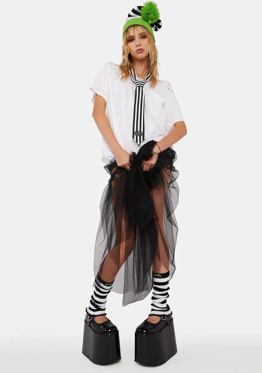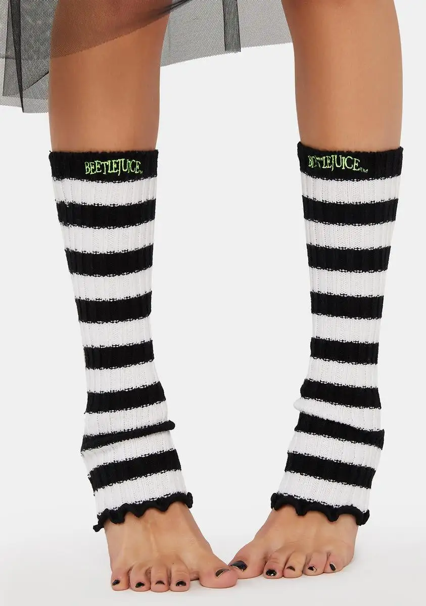 cuz say it! These leg warmers have a knit construction, a striped design, a lettuce trim, and embroidered Beetlejuice logo on the front.