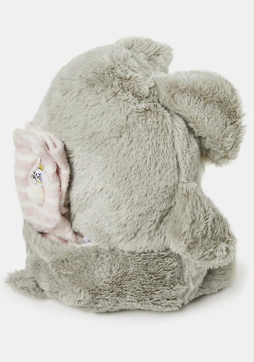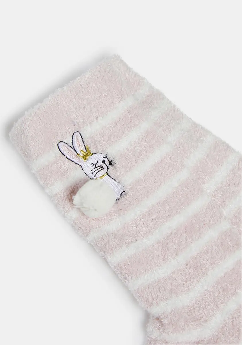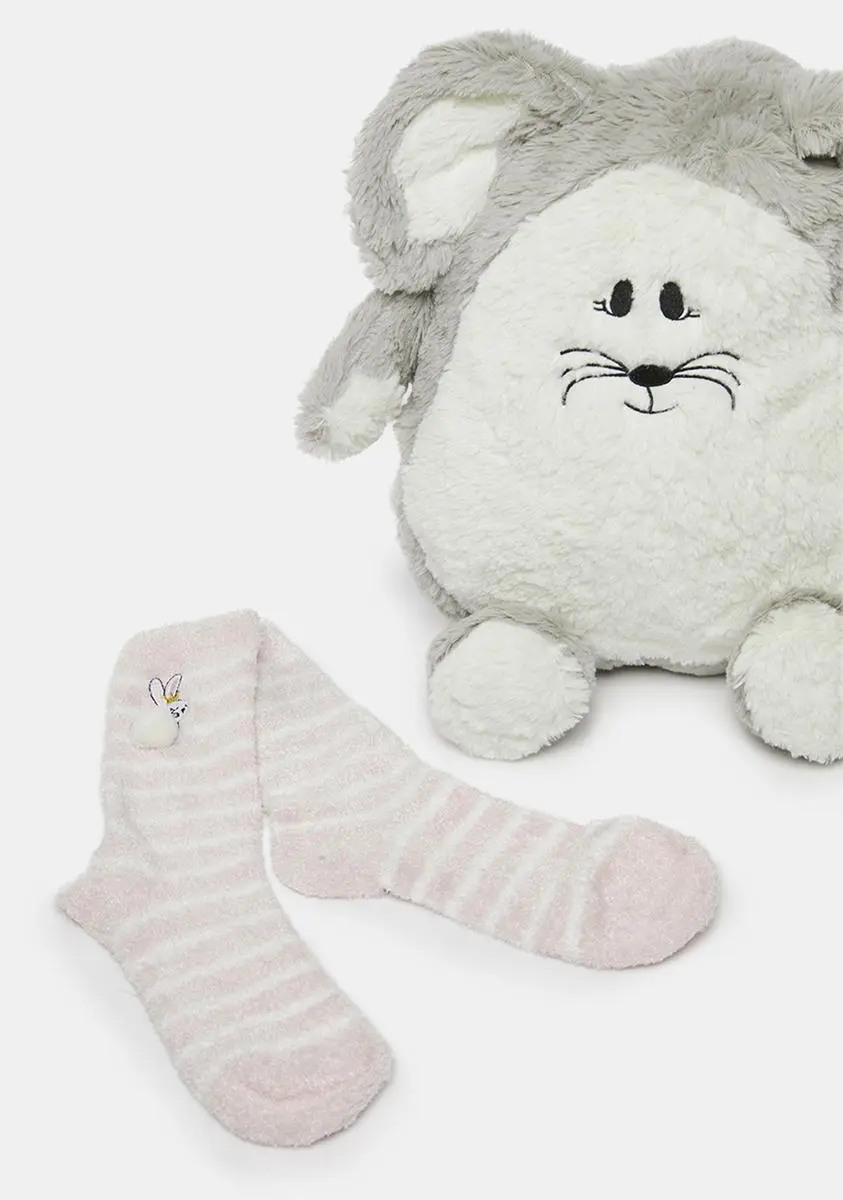 hop on! This 2-piece set has a fuzzy faux fur construction and embroidered details. Includes a plush bunny with a built-in back pocket and striped crew socks.