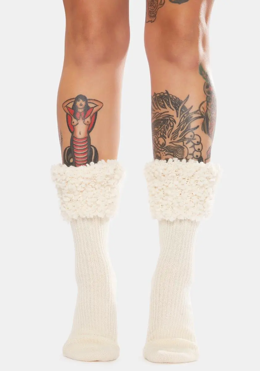 stay extra cozy in these ribbed crew socks that have a knit construction and fuzzy cuffs.
