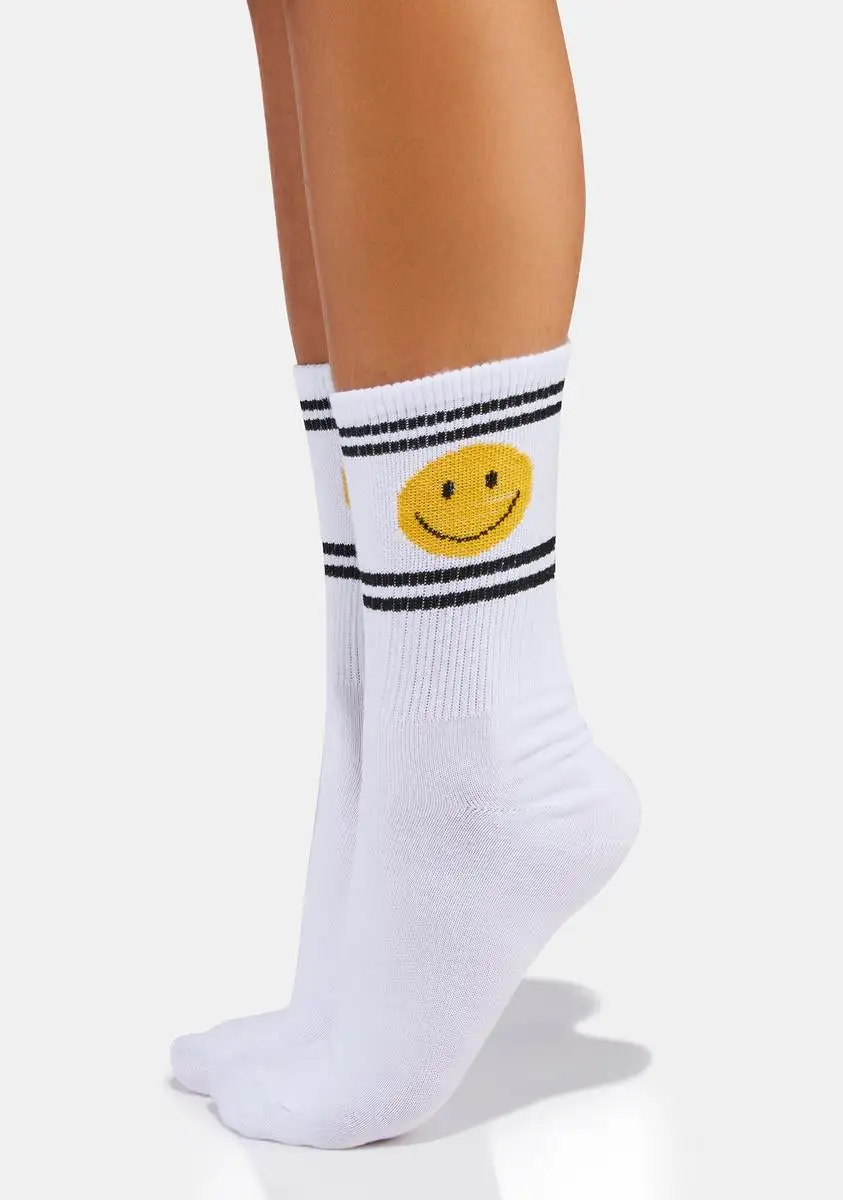 have a knit construction, double stripes, and a smiley face graphic on the side.
