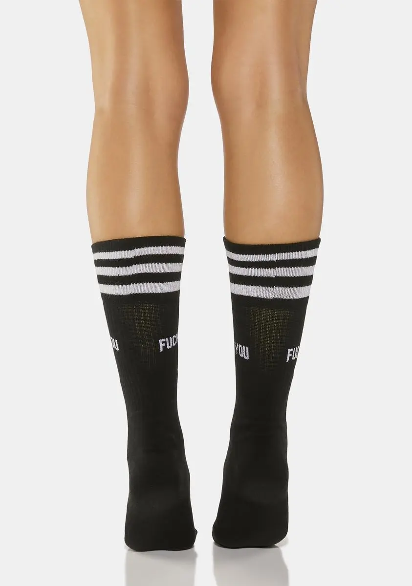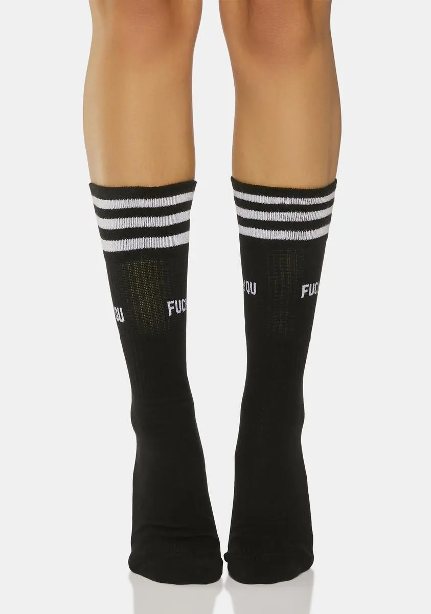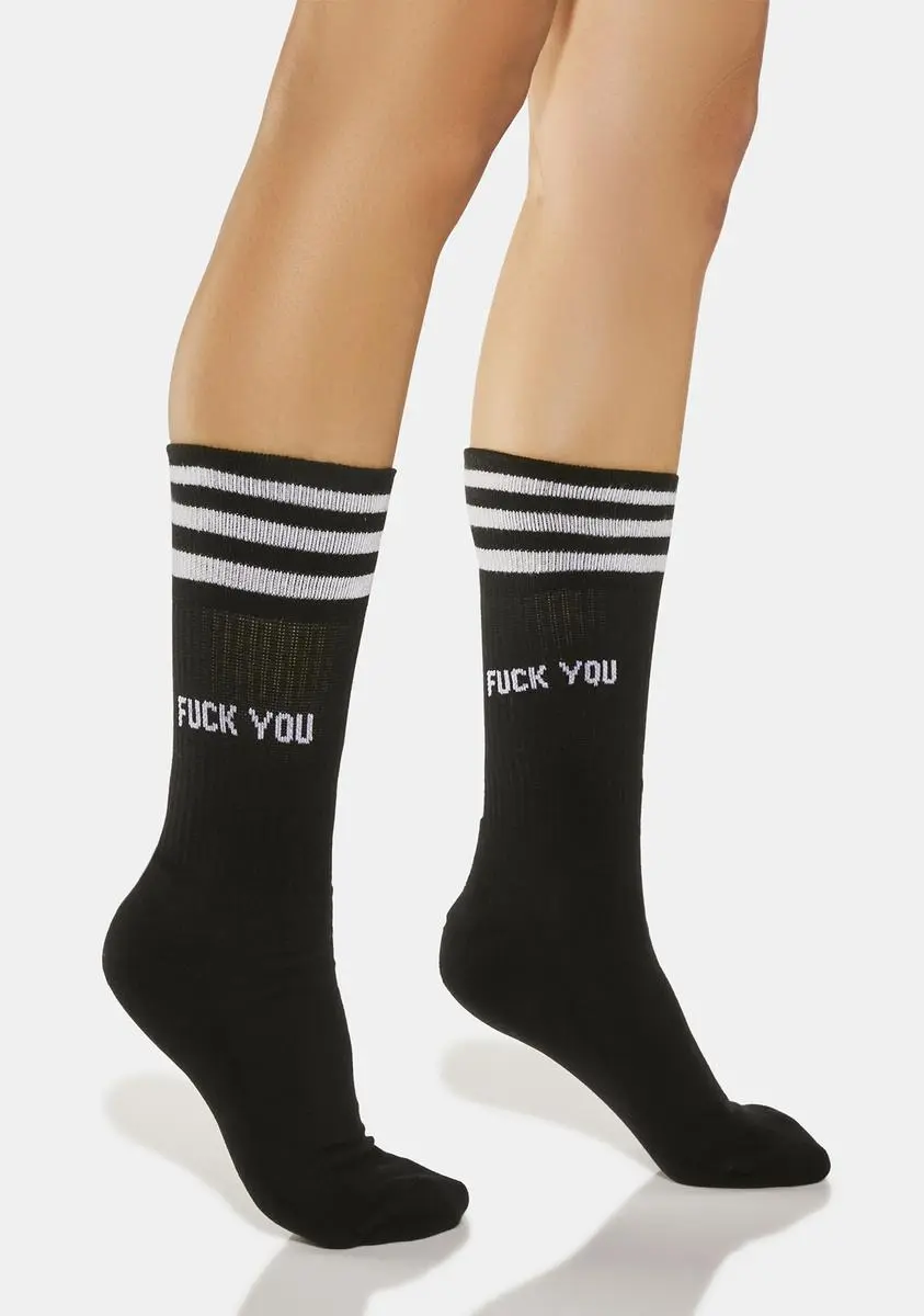 got you on your worst behavior. These crew socks have “Fuck You” printed at sides, a comfortable ribbed knit fabrication, and three athletic-style stripes printed at top.