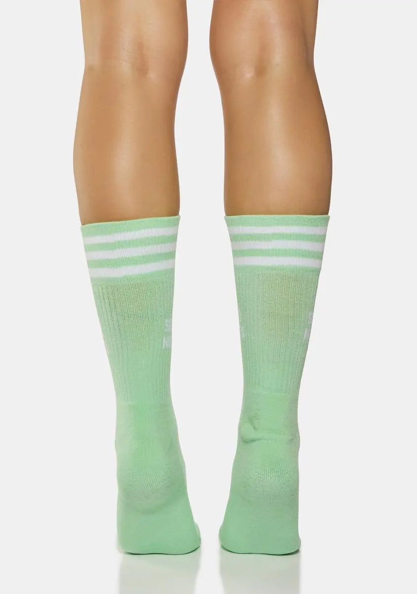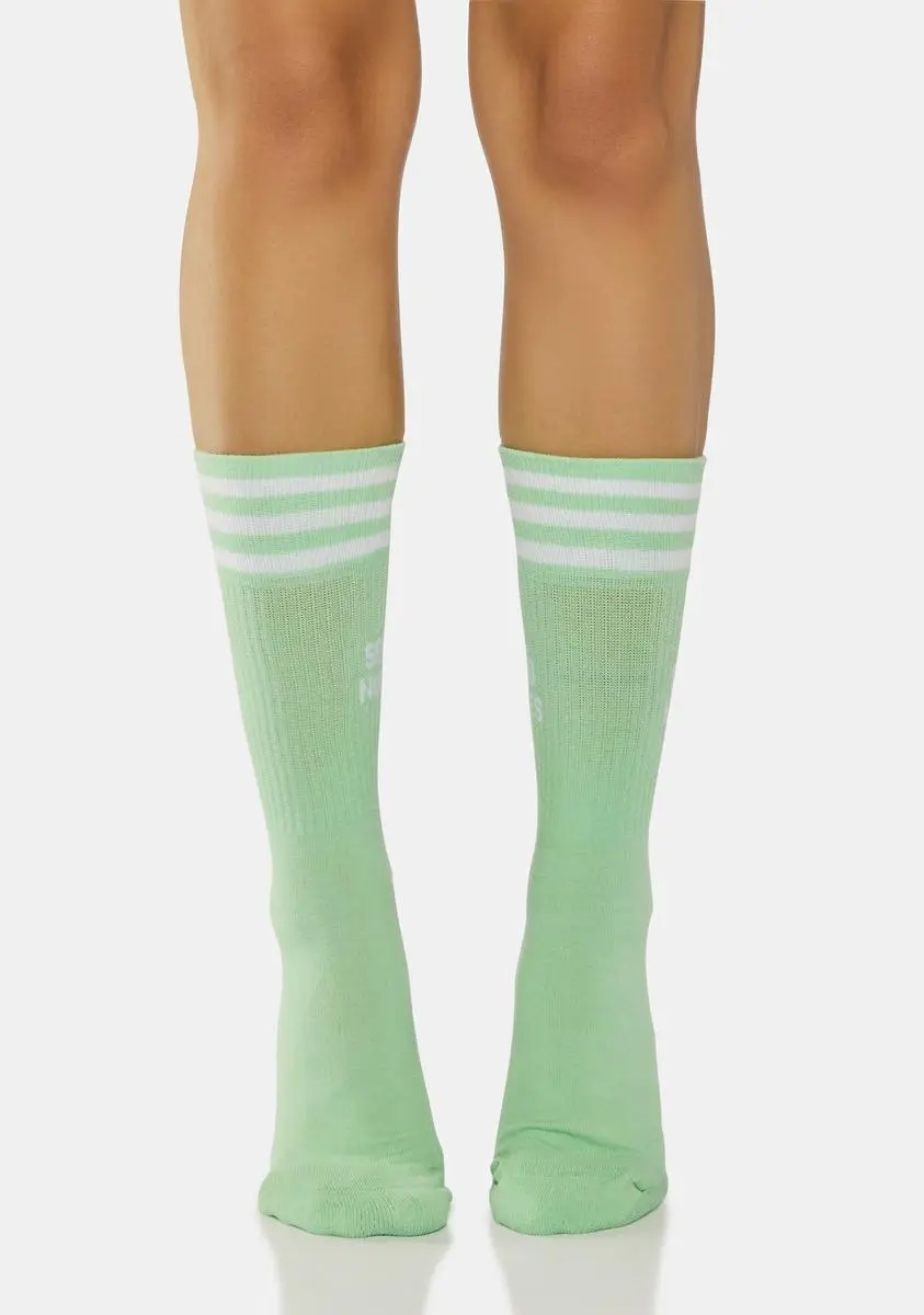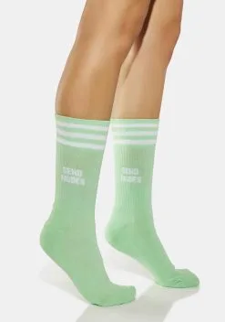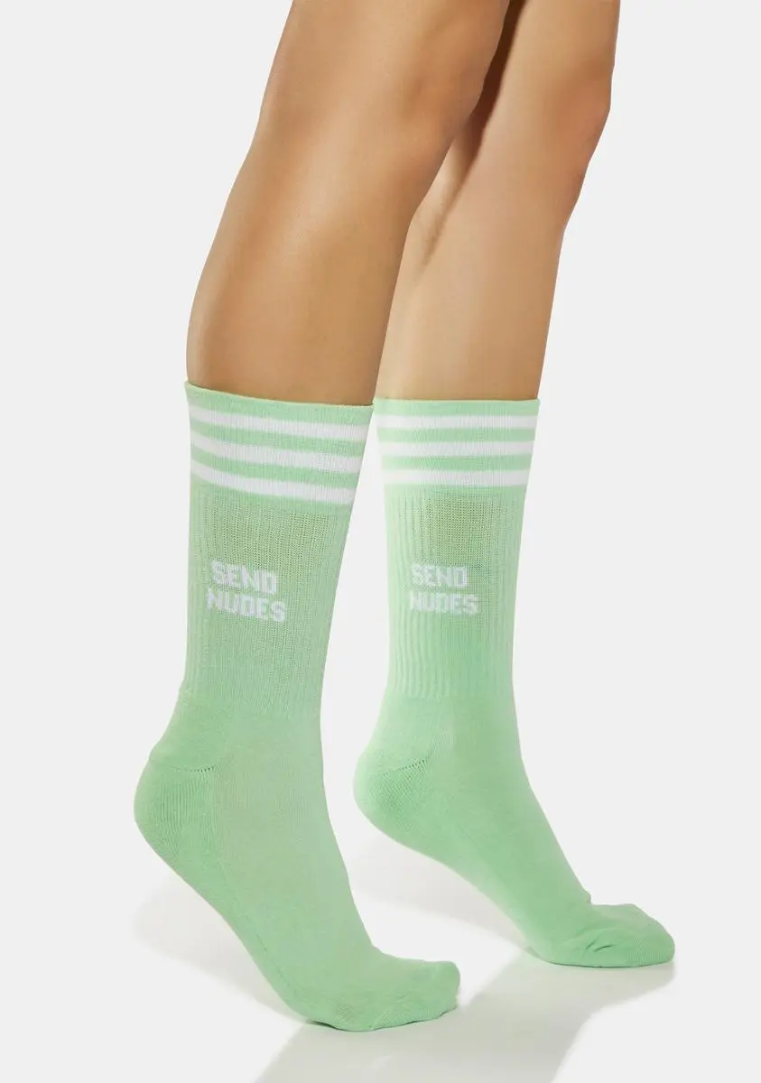 cuz you like to be naughty. These crew socks have “Send Nudes” printed at sides, a comfortable ribbed knit fabrication, and three athletic-style stripes printed at top.