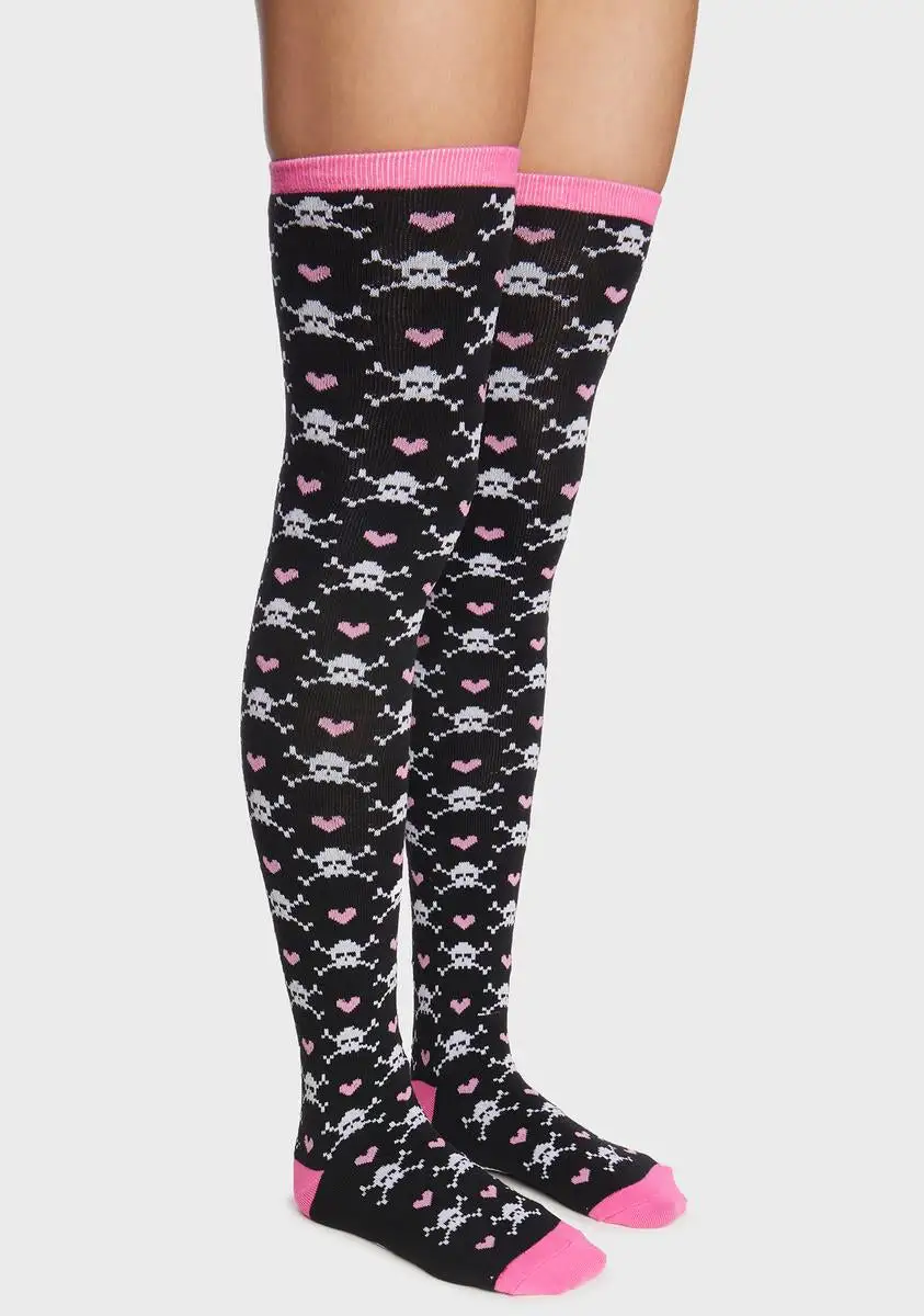 got you reppin’ the dead. These over-the-knee socks have skull and heart graphics and ribbed trim.