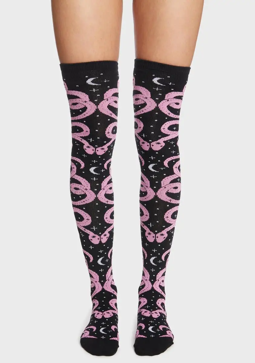 hisssss! These thigh-high socks have snake and crescent moon graphics and ribbed trim.
