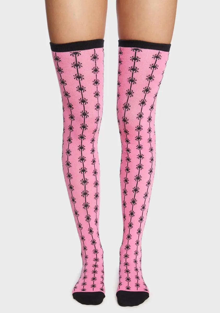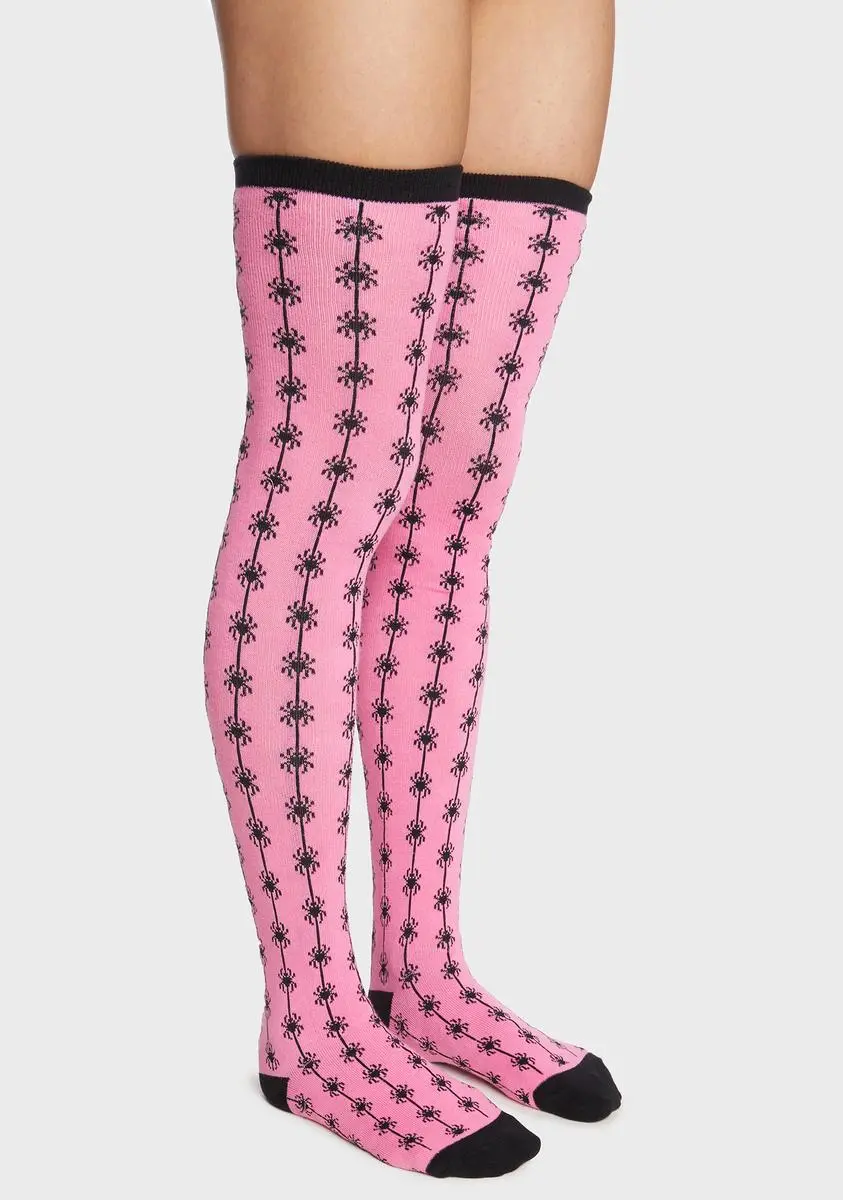 look who’s creepin’! These thigh-high socks have spider graphics and a ribbed trim.