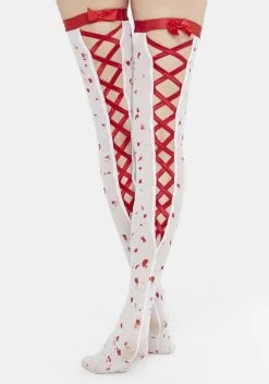 cuz you always shake things up! These thigh high tights have a kawaii skeleton graphic print on the front and satin bow embellishments.