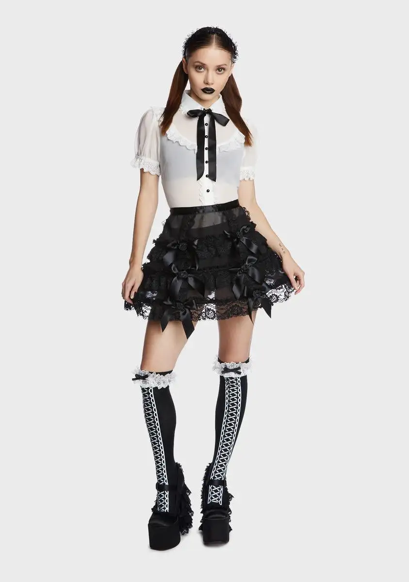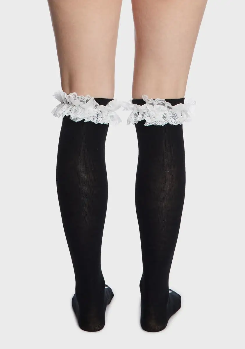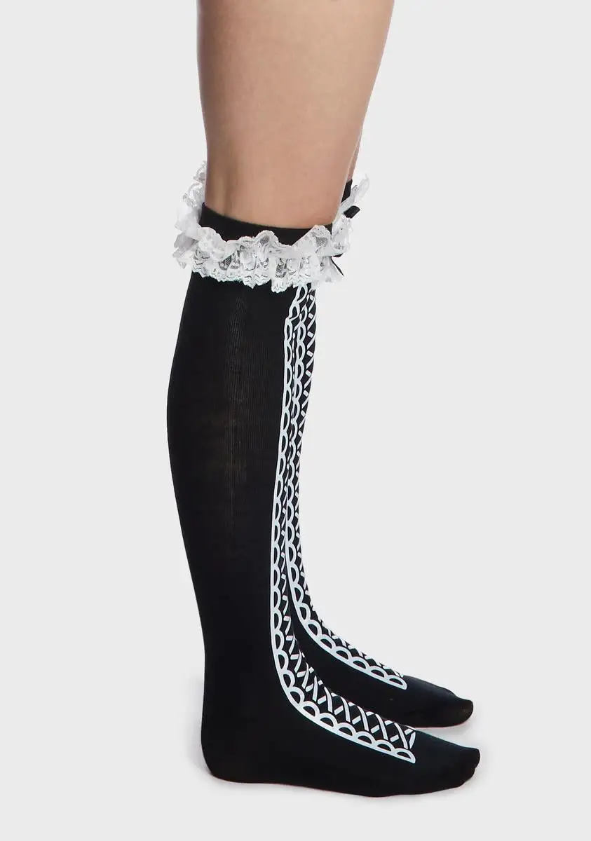 got you payin’ your respects. These knee-high socks have a knit construction, mock lace-up tie graphics at front, ruffled lace trim, and bow appliques.