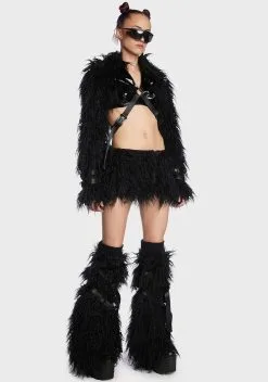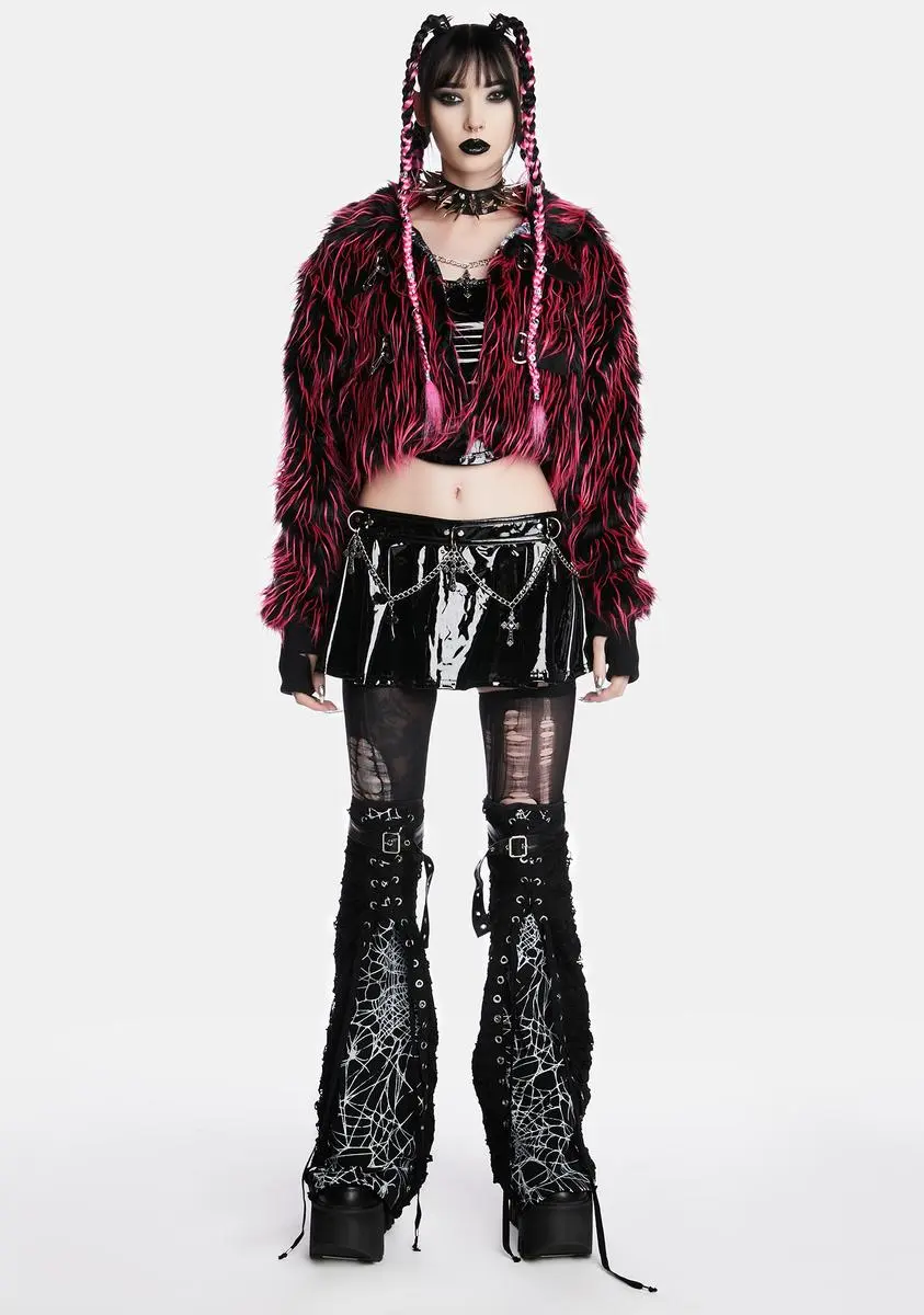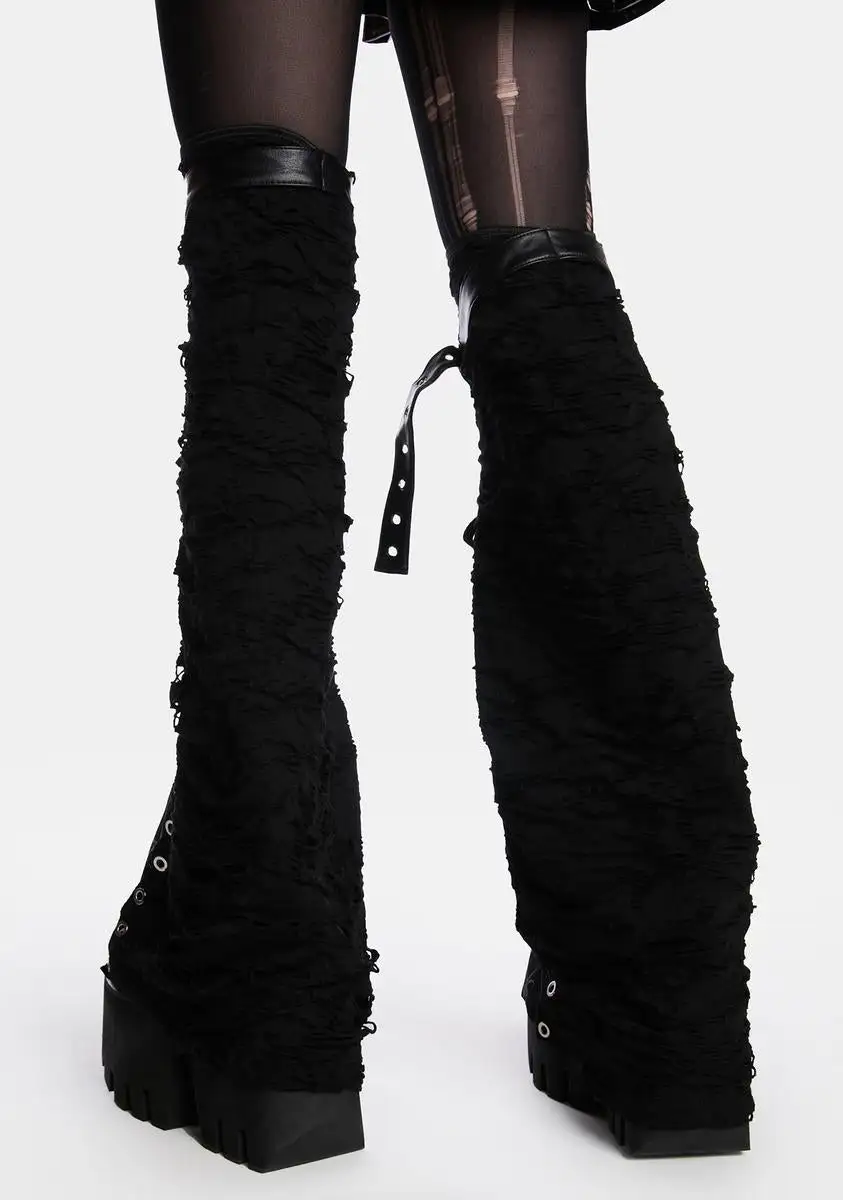 goin’ straight to your brain. These leg warmers have a shredded knit construction, spider web print front panels, lace-up details with grommet hardware, and adjustable buckle strap closures.