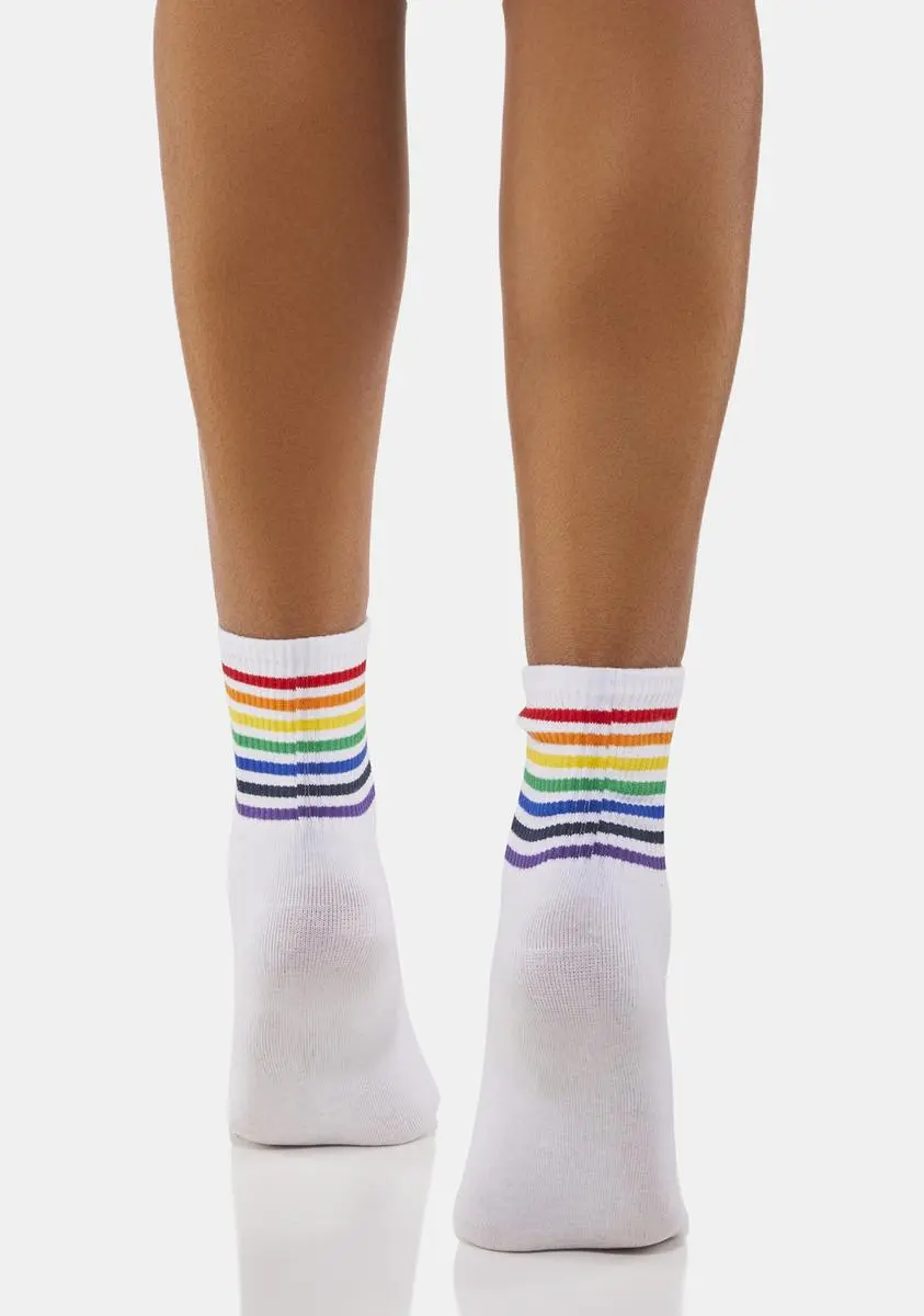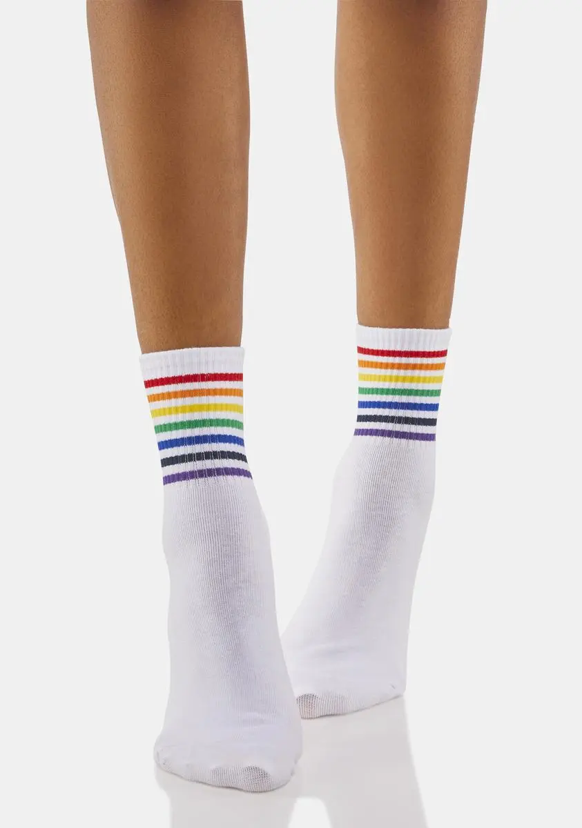 express yourself. These socks come in a ribbed knit construction, with a rainbow striped pattern.