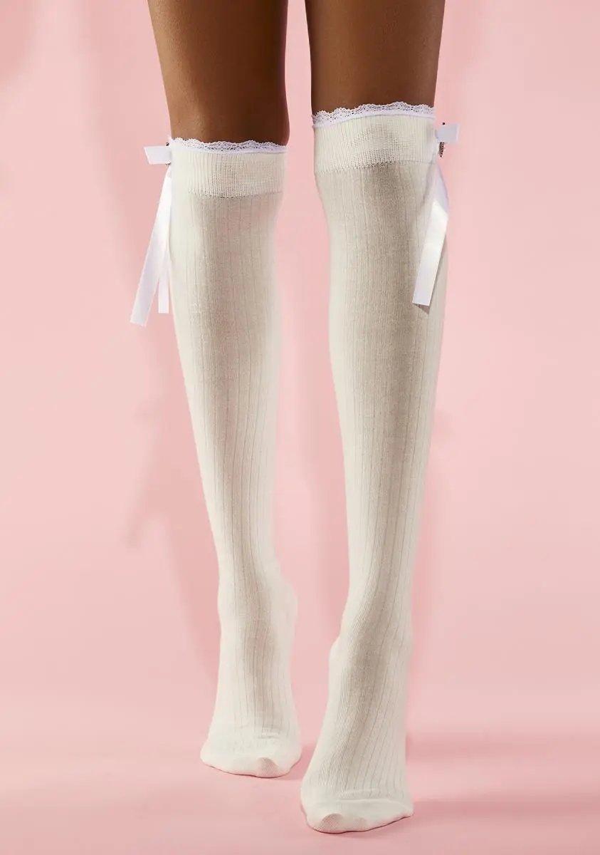 cuz you’re such a tease. Make them notice with these thigh high socks that have a knit ribbed construction and a ribbon bow with a pearl charm in the center on the sides.