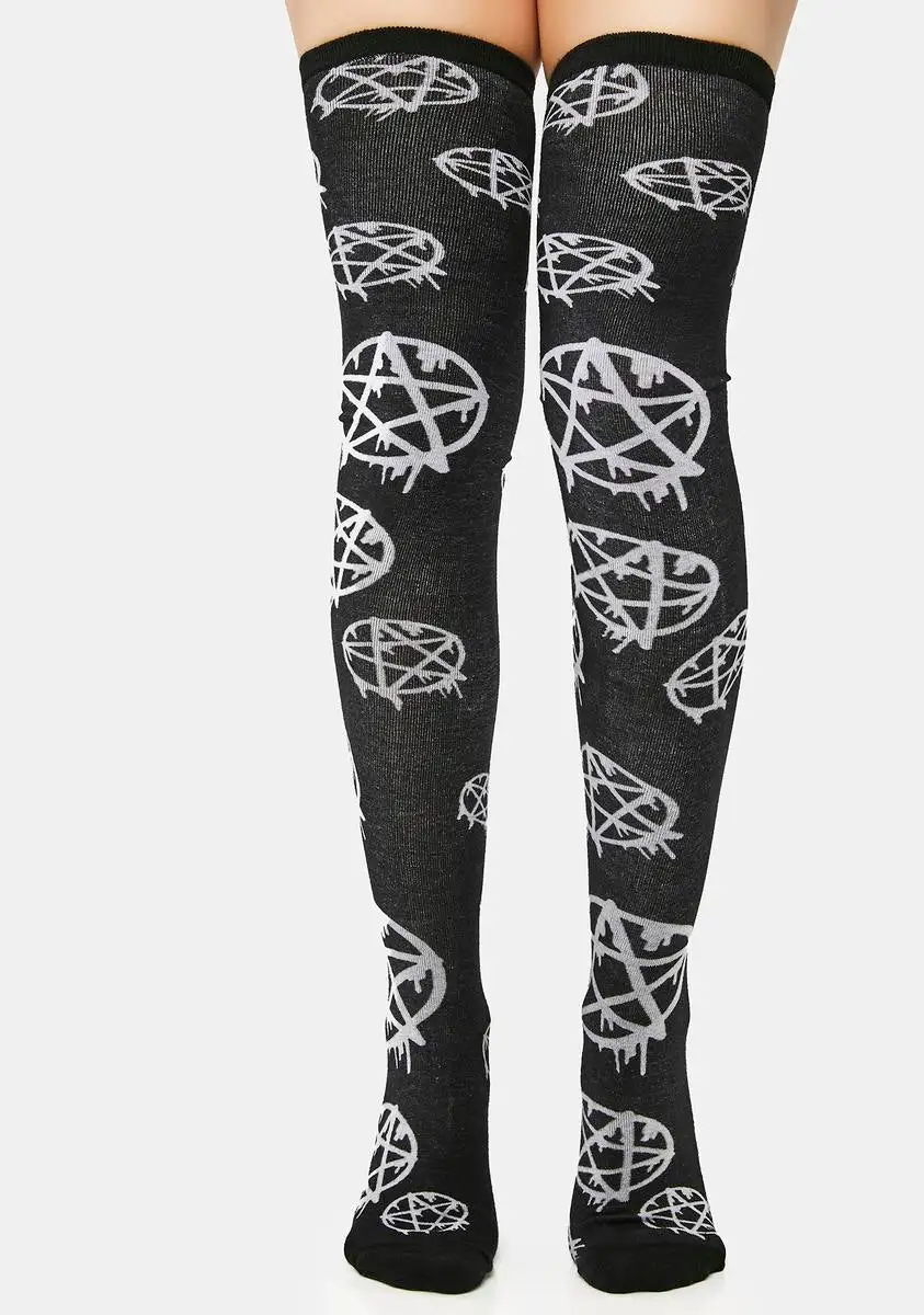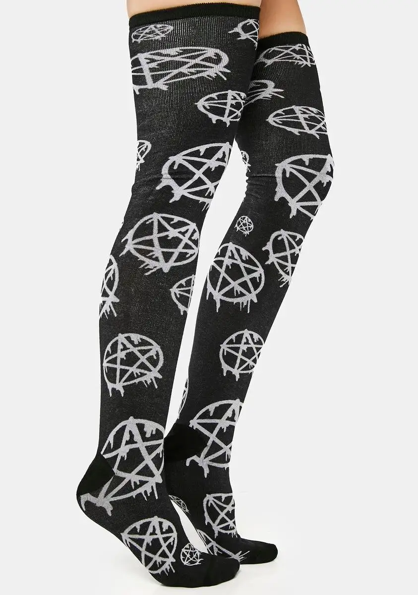 embrace the darkness. These thigh high socks have a lightweight knit construction and a drippy pentagram print all over.