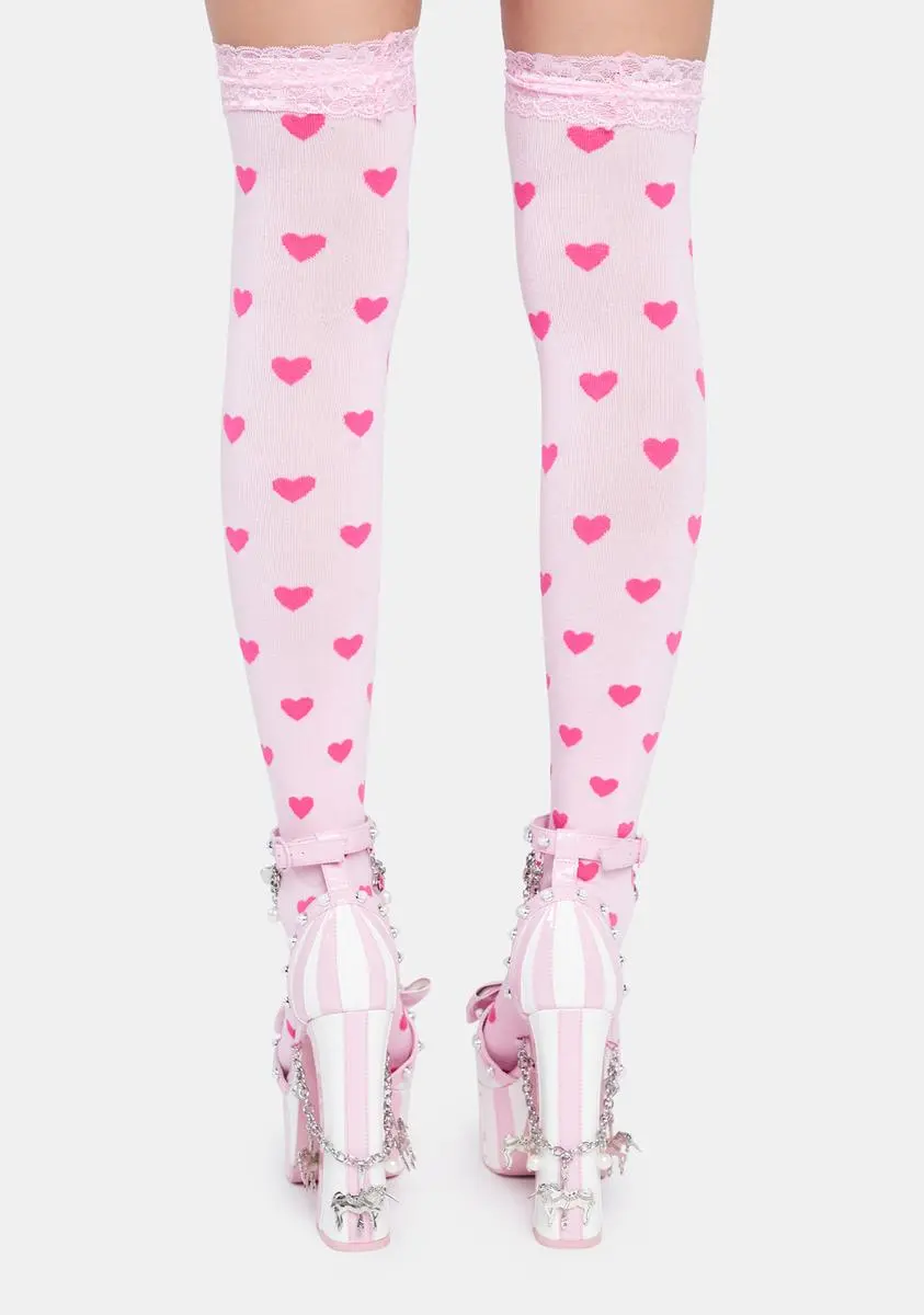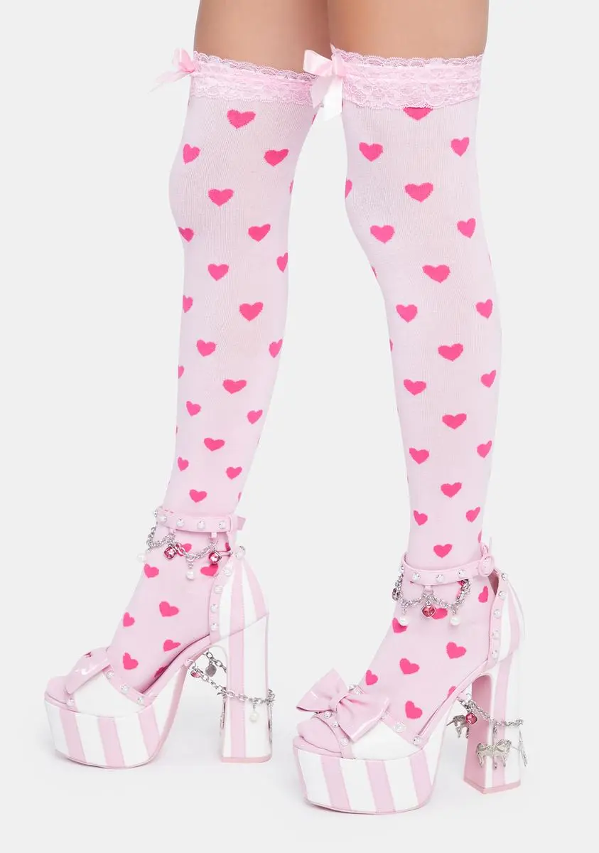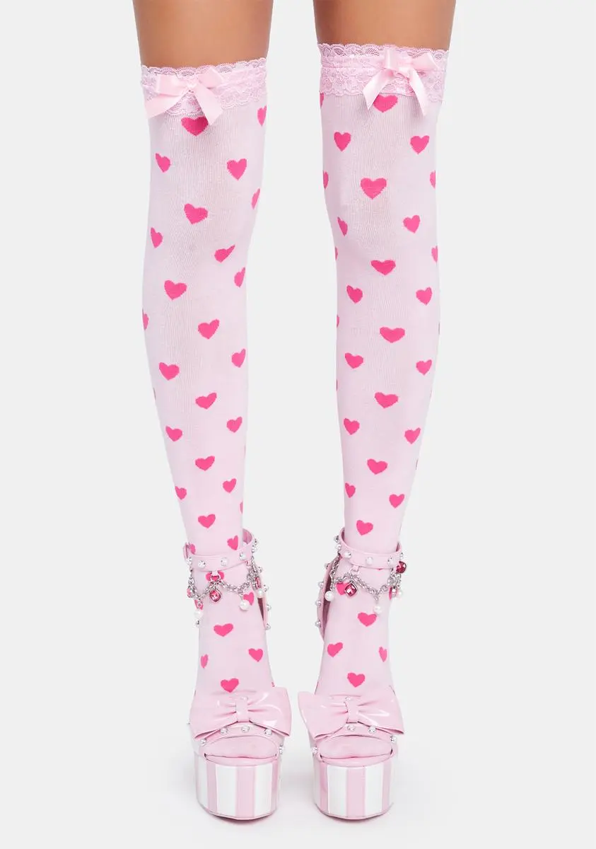 cuz you’re head over heels. These socks come in a thigh high construction, with lace trim details, ribbon bow details, and a heart print all over.