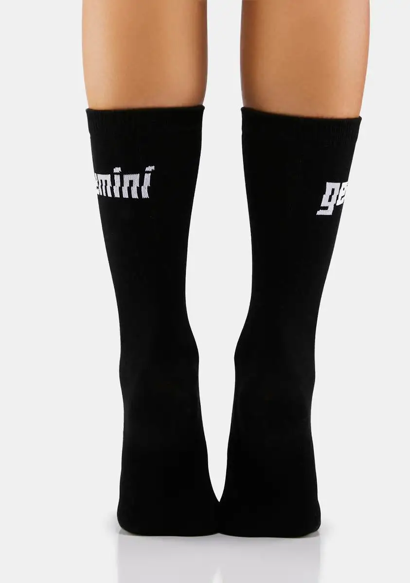 cuz you know it all. These socks come in a crew length, knit construction, with ‘gemini’ text on the side.