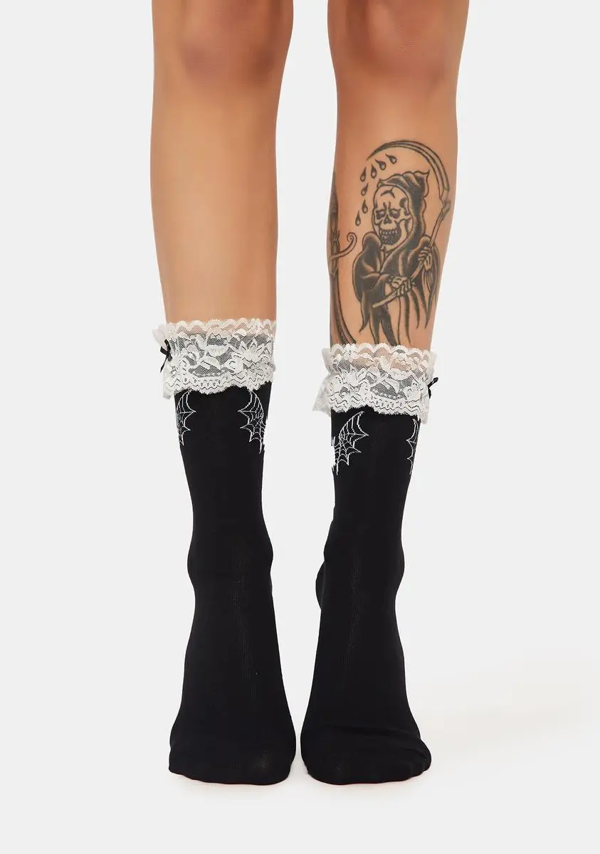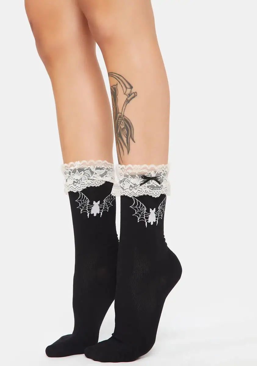 have contrast lace trim, little bow details, and bat graphics.