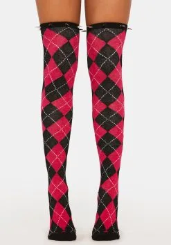 cuz you’re in trouble, bb! These thigh-high socks have an argyle print all over and spiked studs embellished at top.