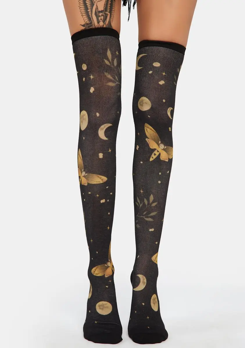 give ’em celestial dreams. These thigh high socks have a lightweight knit construction with a moth print all over and moon graphics.