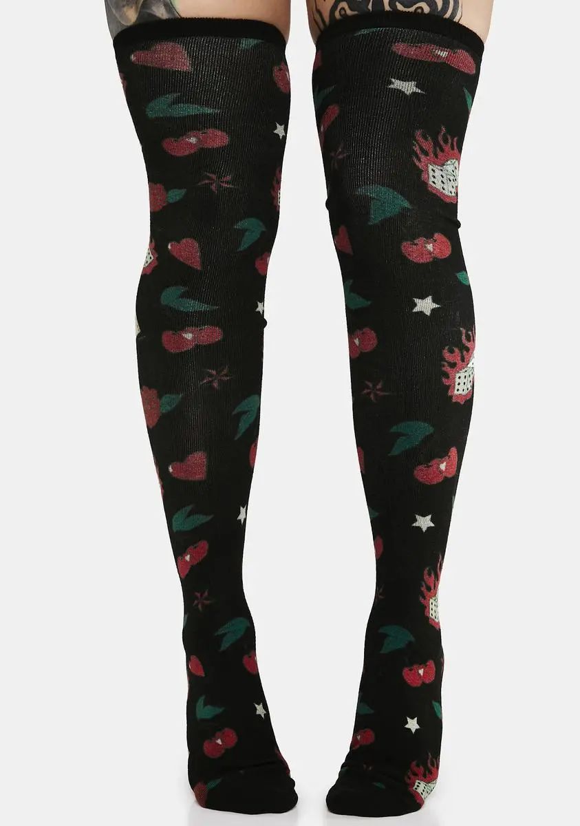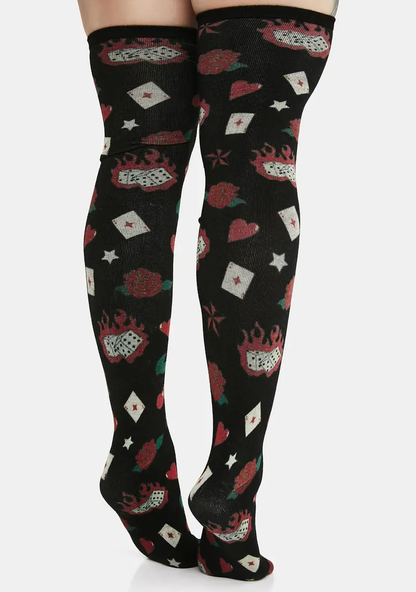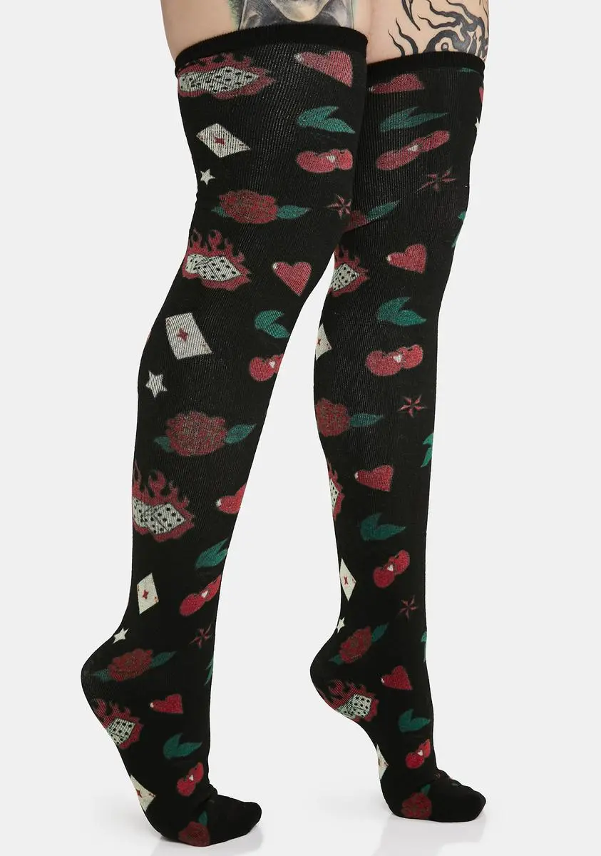cuz you’ve got an old rock and roll soul. These socks come in a thigh high construction, with a dice, cards, cherry, rose, and heart print all over.