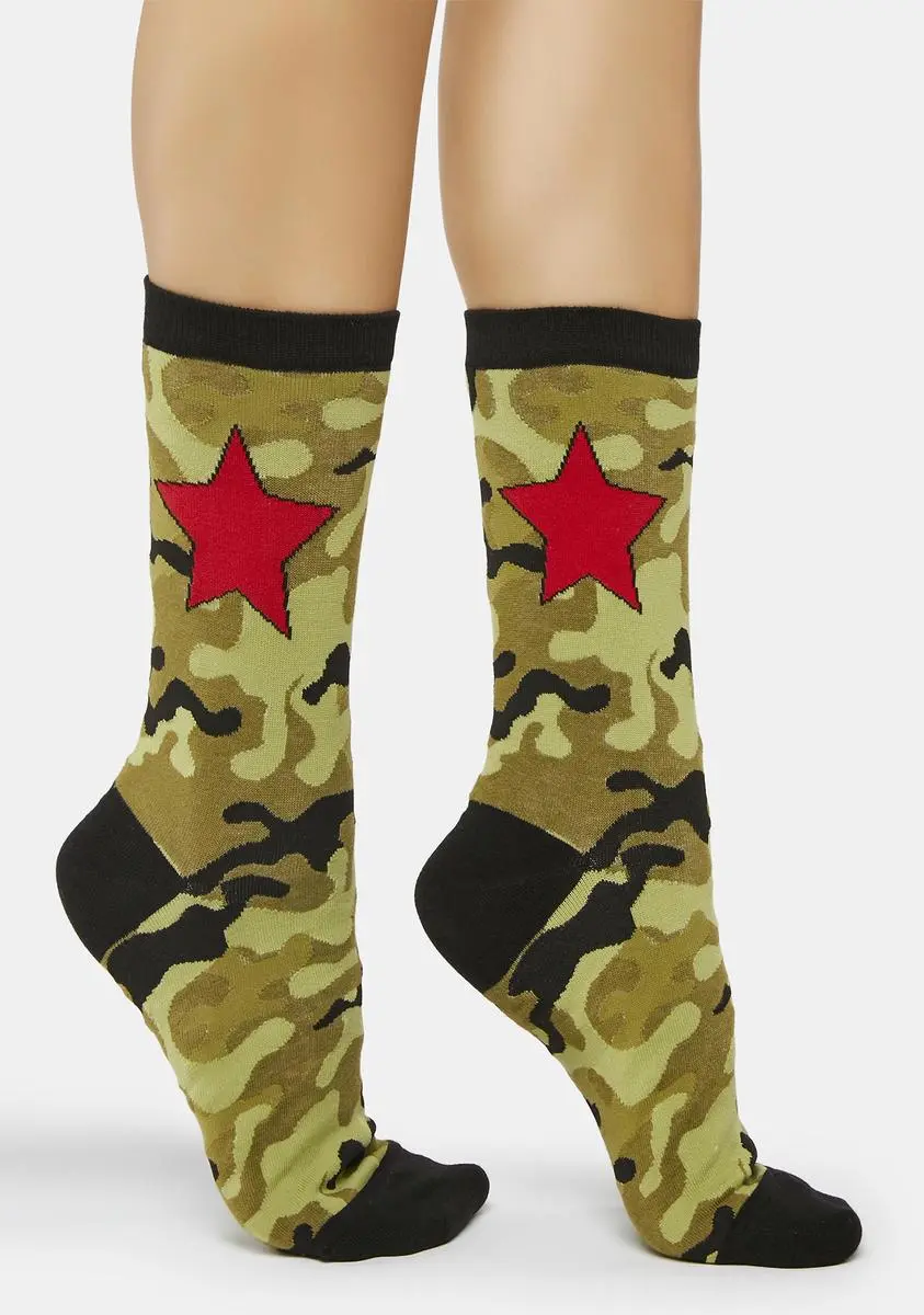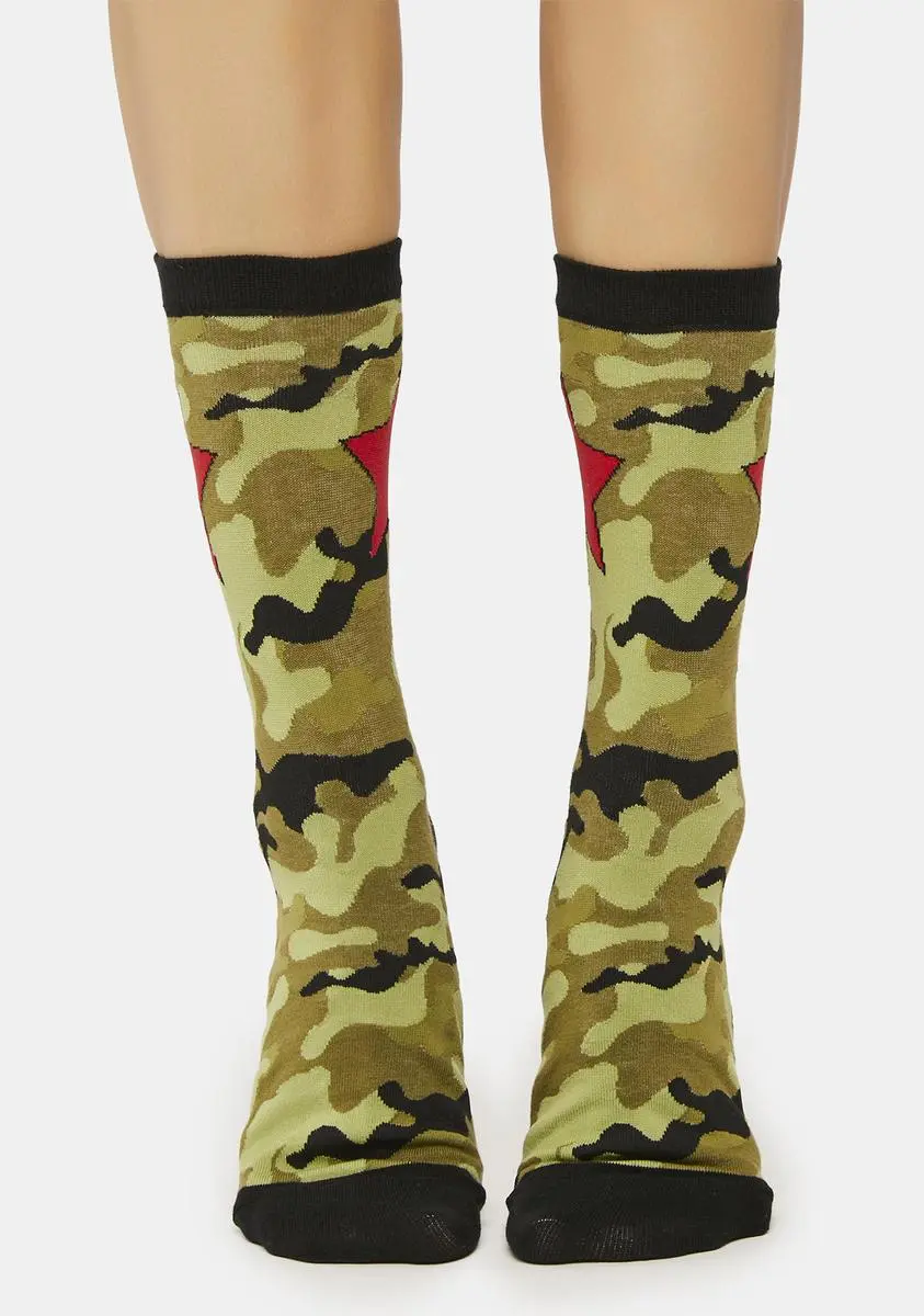 cuz you’ve got a bad feeling about this. These crew socks have an all over camo pattern, a contrast colored trim, and red star detailing.