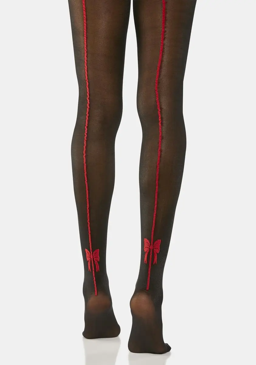 you know how to dress up. These tights have a sheer spandex construction, a contrast red back seam, and printed bow accents at the ankles.