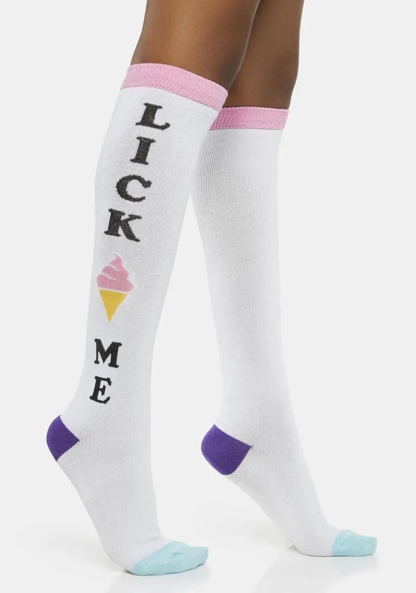 how many samples are too many? These knee-high socks have “Lick Me” printed at sides, ice cream cone graphics, and contrast trim.