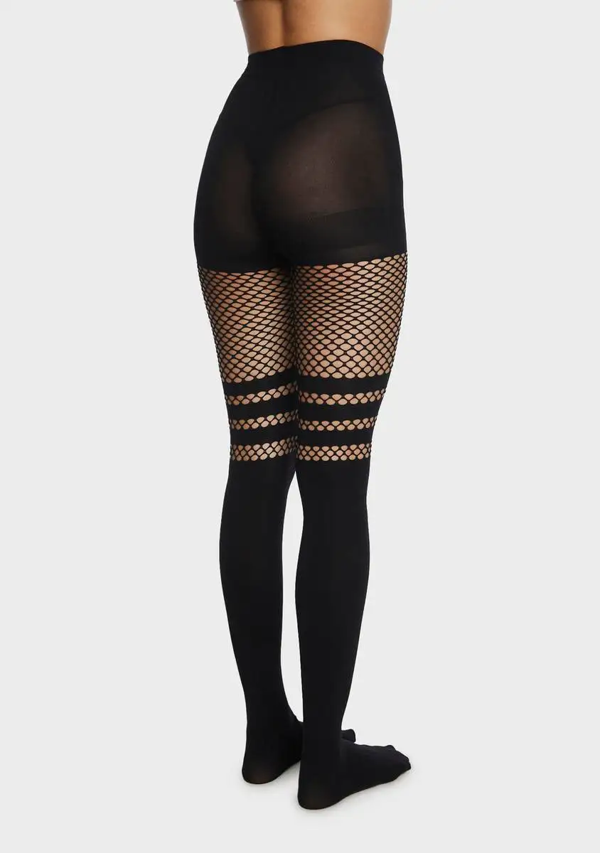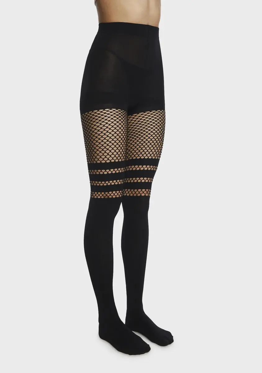 cuz who doesn’t luv an optical illusion, bb? These tights have an opaque body construction, faux thigh high stripes with a fishnet paneled design, and a stretchy pull-on fit.