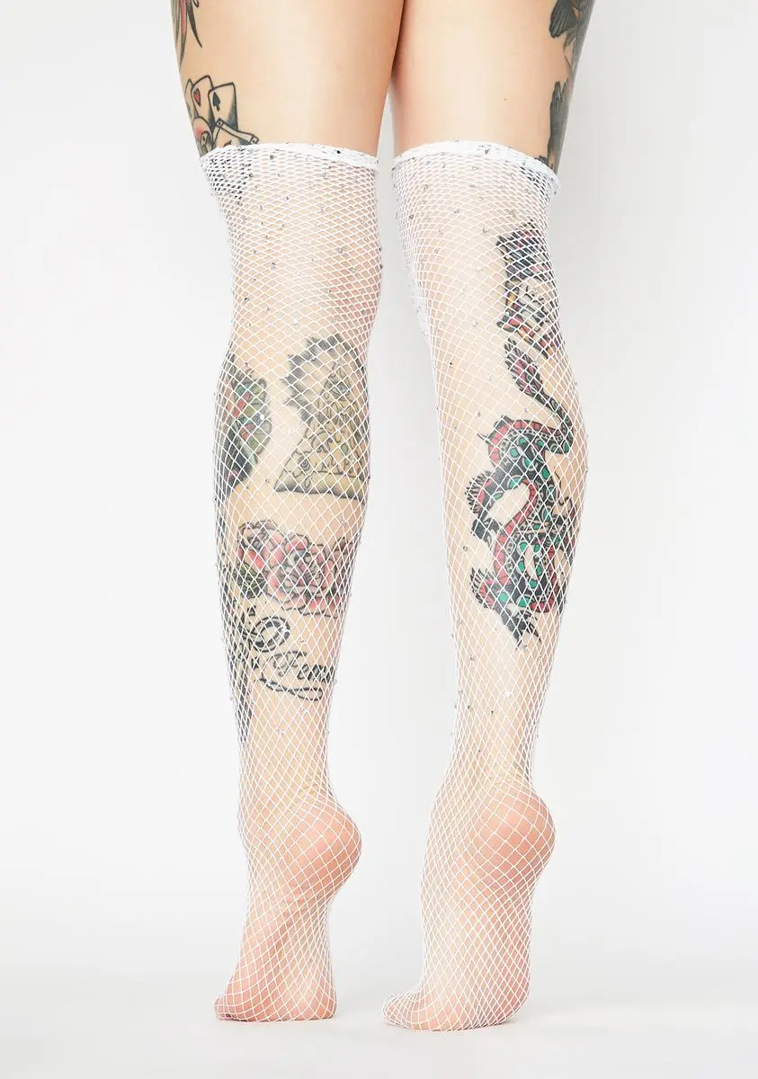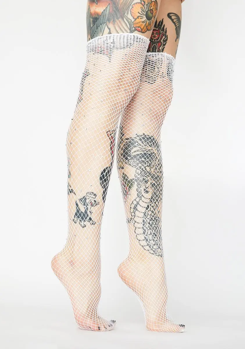 cuz itâs all about opulence, bb! Feel glitzy Nâ sexxy in these fishnet stockings with a stretchy thigh high fit and blinginâ rhinestones all ova.