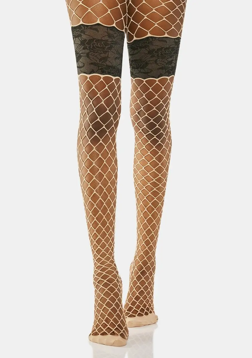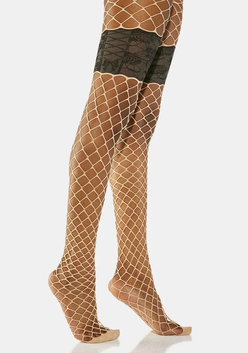 you know how to push my buttons. These tights have a diamond fishnet construction and contrast lace paneling at the thighs that look like faux garters.