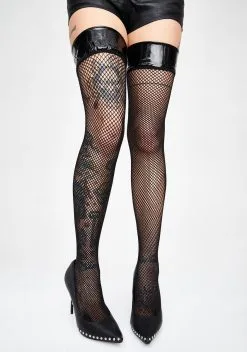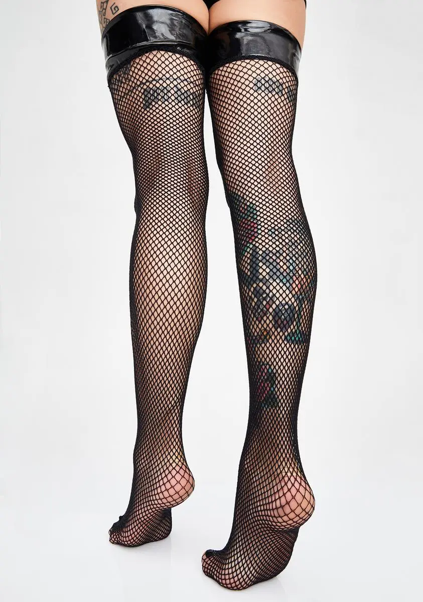 no one tells you what to do. Willing and ready for the dame ready to prowl at night, these vintage-inspired fishnets meet the modernity of bondage and leather. Work those fetish legs, that feature thick, shiny vinyl leather bands that’ll hug yer thighs real tighttt, topped off with a seam toe of worthy construction Slather yer legs to spice up your fit or push provocative with this BB and be the sassy gal you really are.