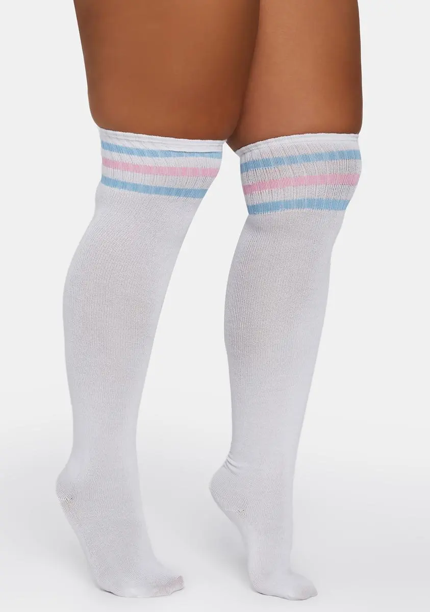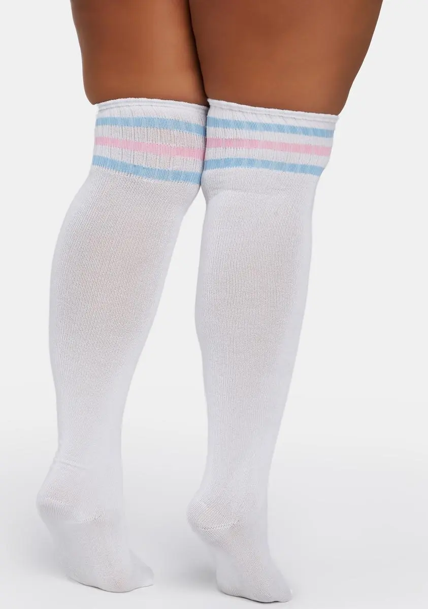 cuz all you do is win, bb! Shoot to score in these cute thigh-high socks that have a stretchy ribbed knit and a sporty striped design at the top.