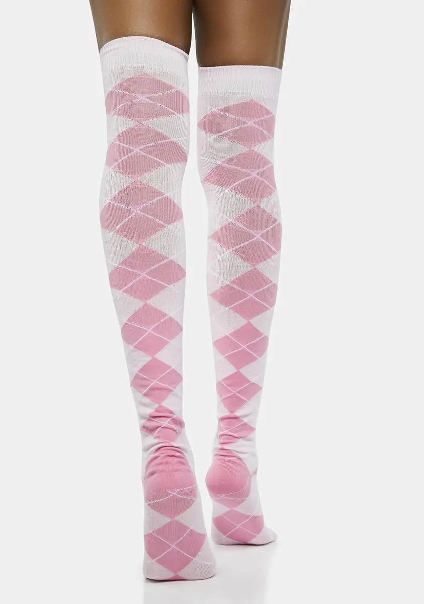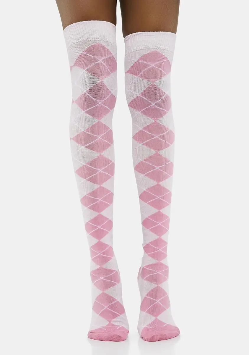 cuz you’re looking for trouble! These thigh-high socks have an argyle print all over and hit mid-thigh.