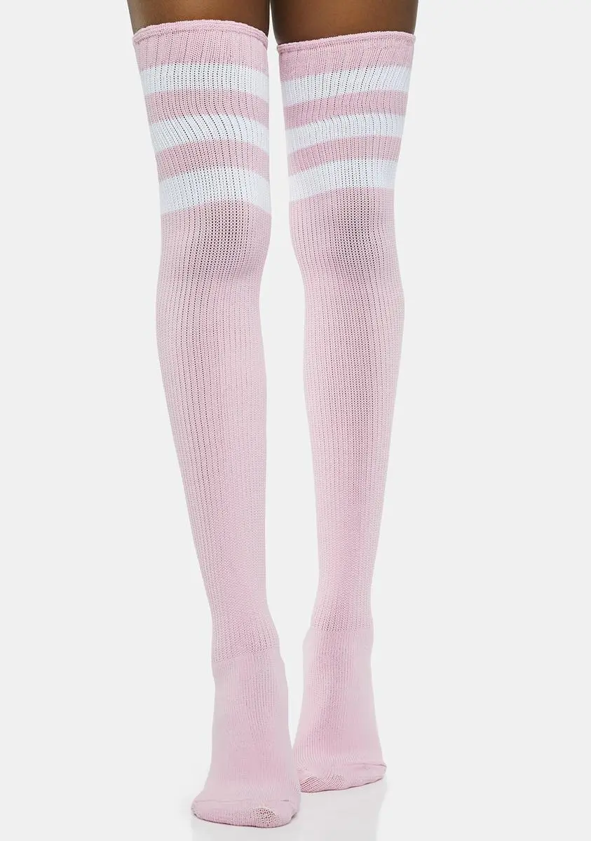 cuz all you do is win, bb! Shoot to score in these cute thigh-high socks that have a stretchy ribbed knit and a sporty striped design at the top.