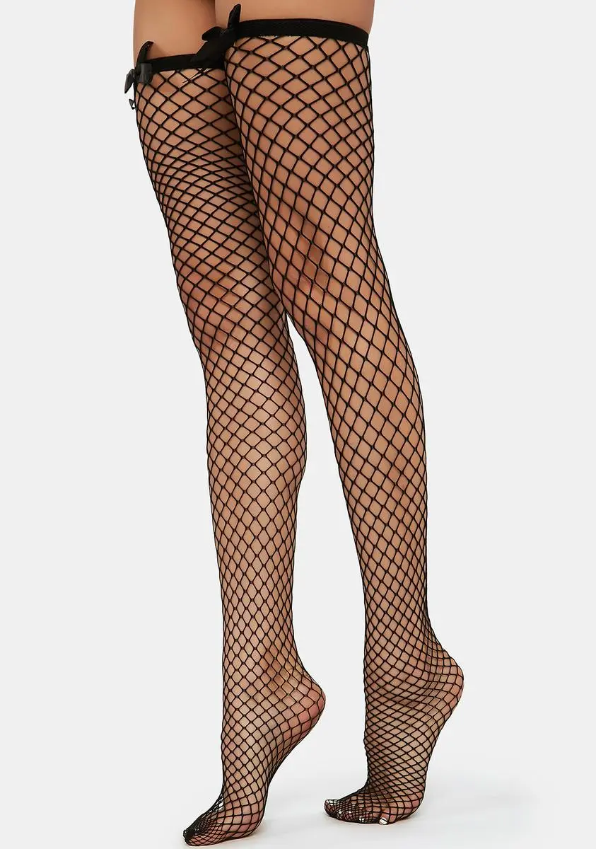 but you playin’. These thigh-high stockings have a sheer fishnet construction and bow appliques at top.