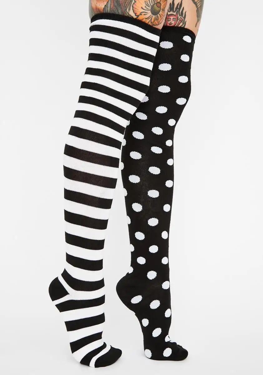cuz ya got two moods⦠Keep ’em guessing in these thigh high socks that have polka dot print on one and a stripe pattern on the other.