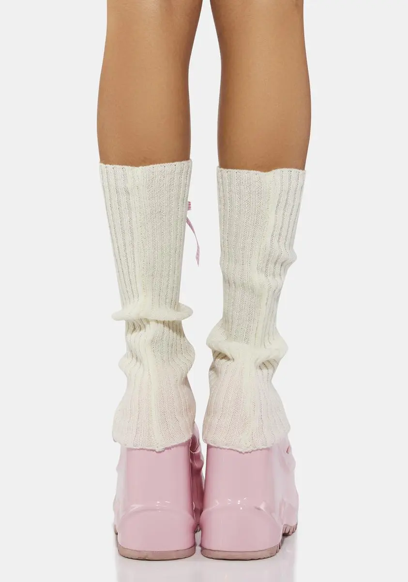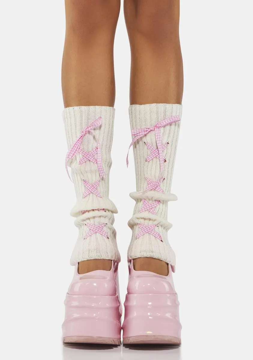 cuz you always put a smile on their face! These slouchy leg warmers have a ribbed knit construction and gingham lace-up details on the front.