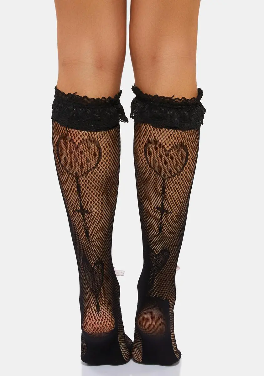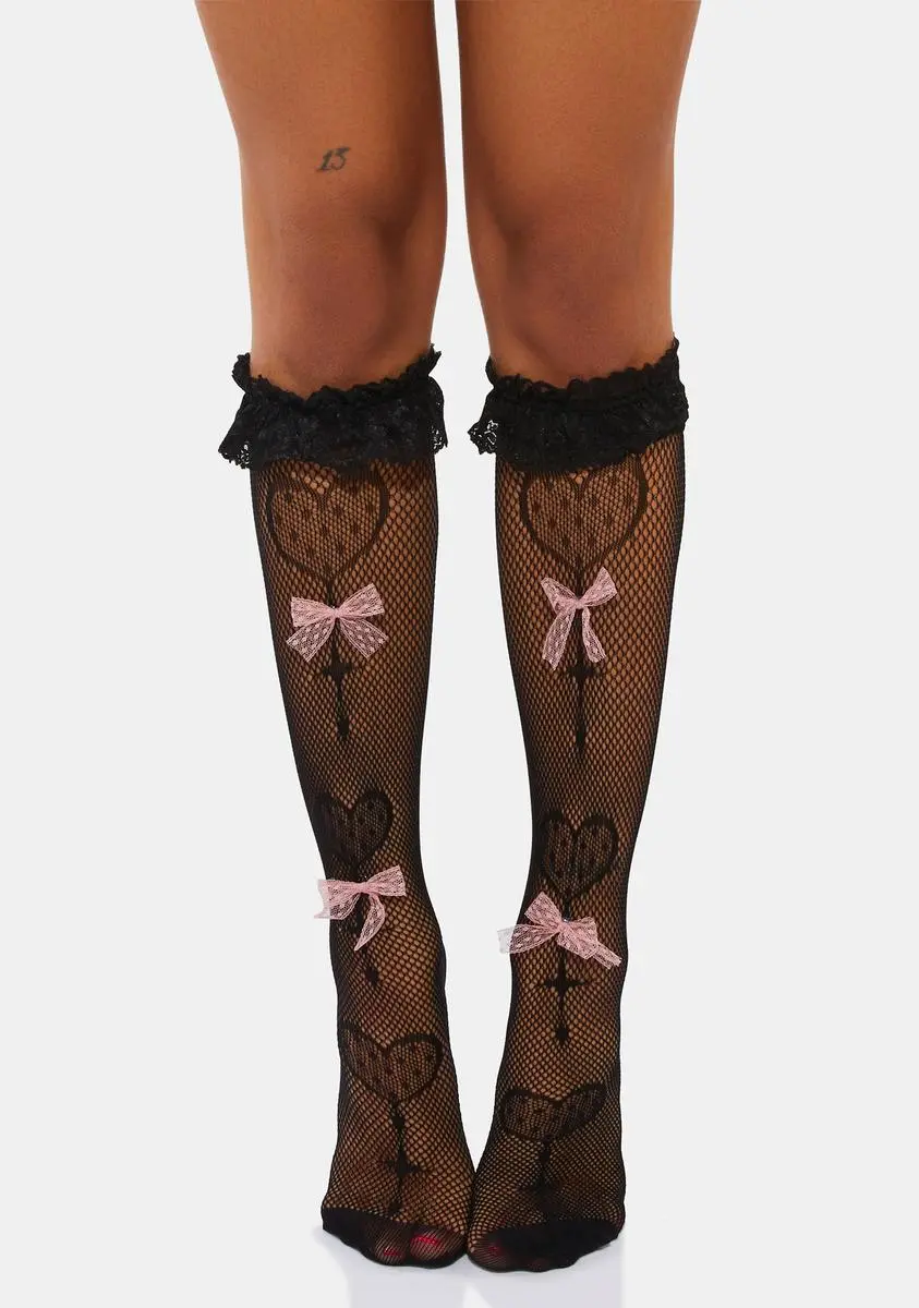 cuz you keep e’m babe! These knee high socks have a sheer lace construction with a ruffled trim, a heart graphic design, and bow attachments on the front.