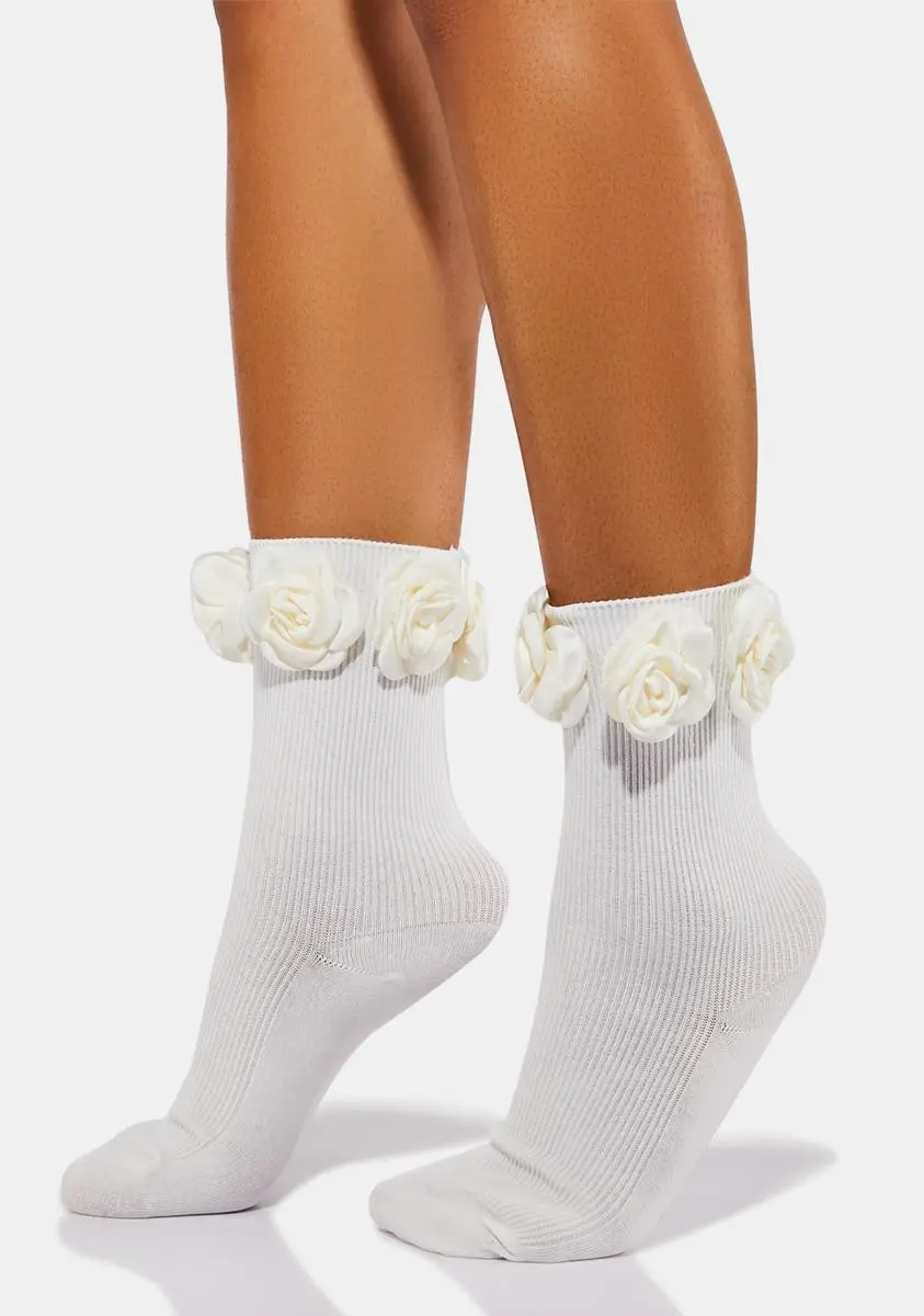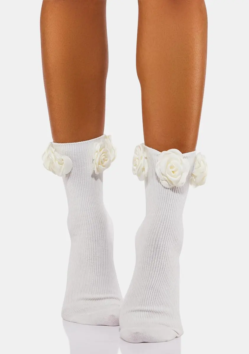 spring into spring! These crew socks have a stretchy construction and large floral appliques.