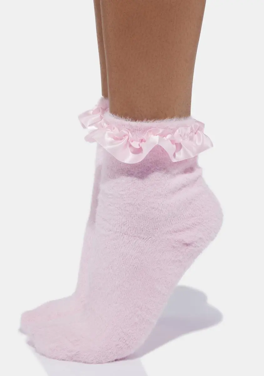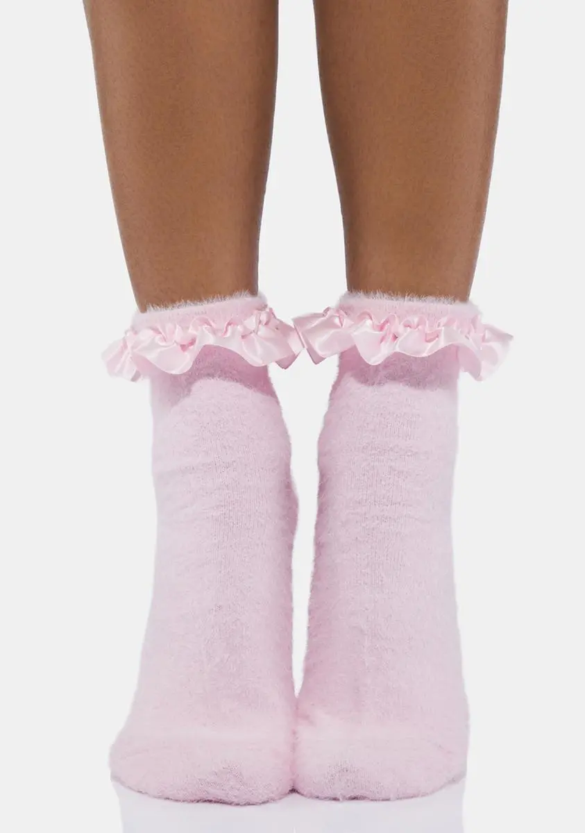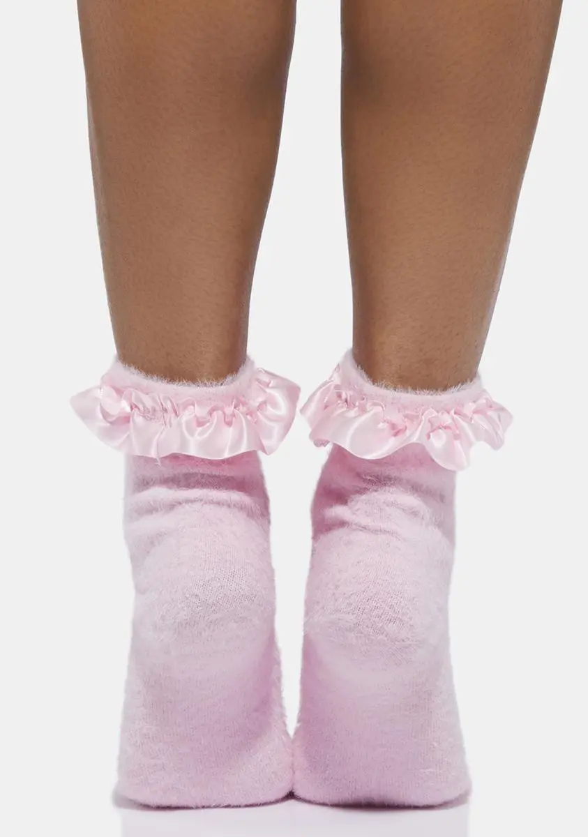 because you’re ever-so-alluring. These socks have a fuzzy construction, an ankle length fit, and a satin ruffle trim.