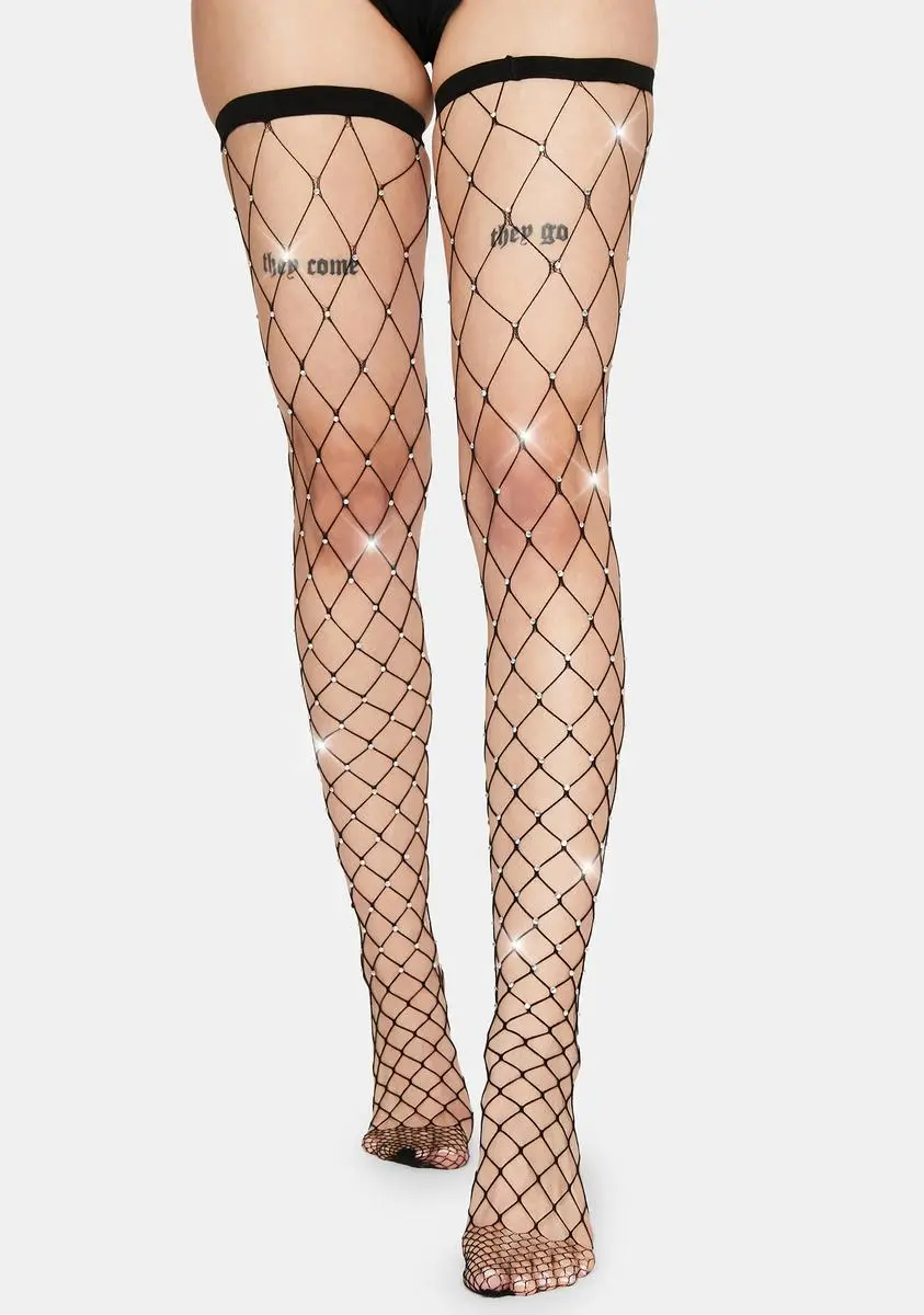 cuz youâre a true diamond! These fishnet thigh highs have a wide diamond design with rhinestones all over.