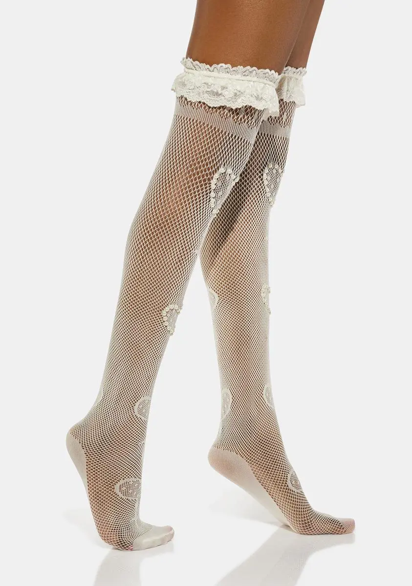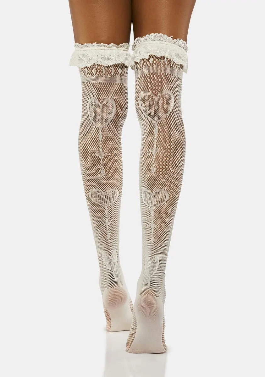 you sweep me off my feet. These thigh high socks come in a fishnet construction, with lace trim, and heart and cross details.