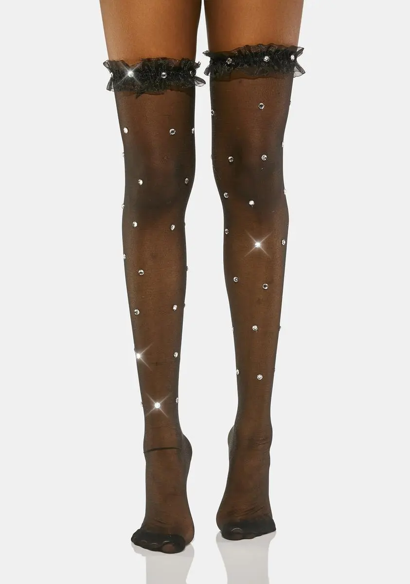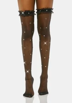 cuz you’re such a social butterfly. These thigh high socks have a sheer construction, a frilly trim, and rhinestones all over.