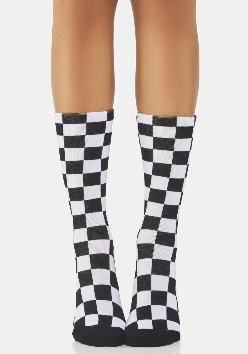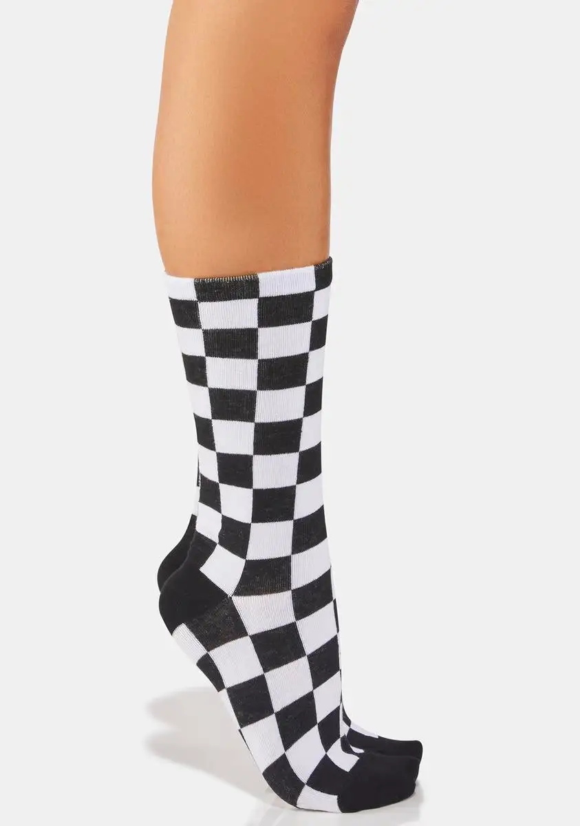 got your mind racing! These crew socks have a checkered print all over with solid toes and heel flaps.