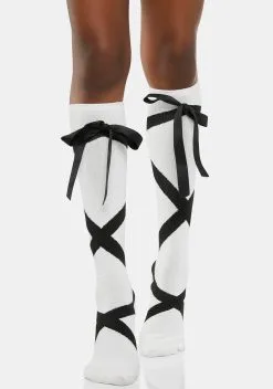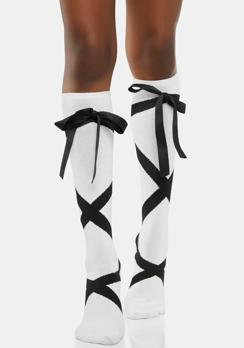 cuz you follow the rules (sometimes). These knee-high socks have a lace-up graphic printed all over and bow appliques at the top.