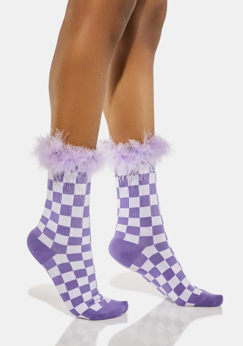 got you ruffling some feathers. Dare to be different in these ribbed crew socks in a purple and white checkered print with fluffy feather trim at the top.