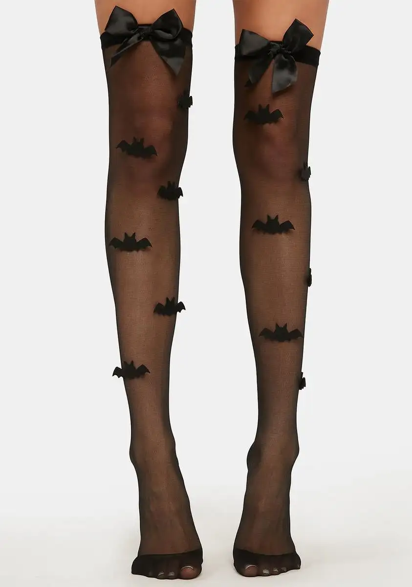 cuz daytime is not for you. These thigh-high stockings have a stretchy sheer construction and bat appliques all over.